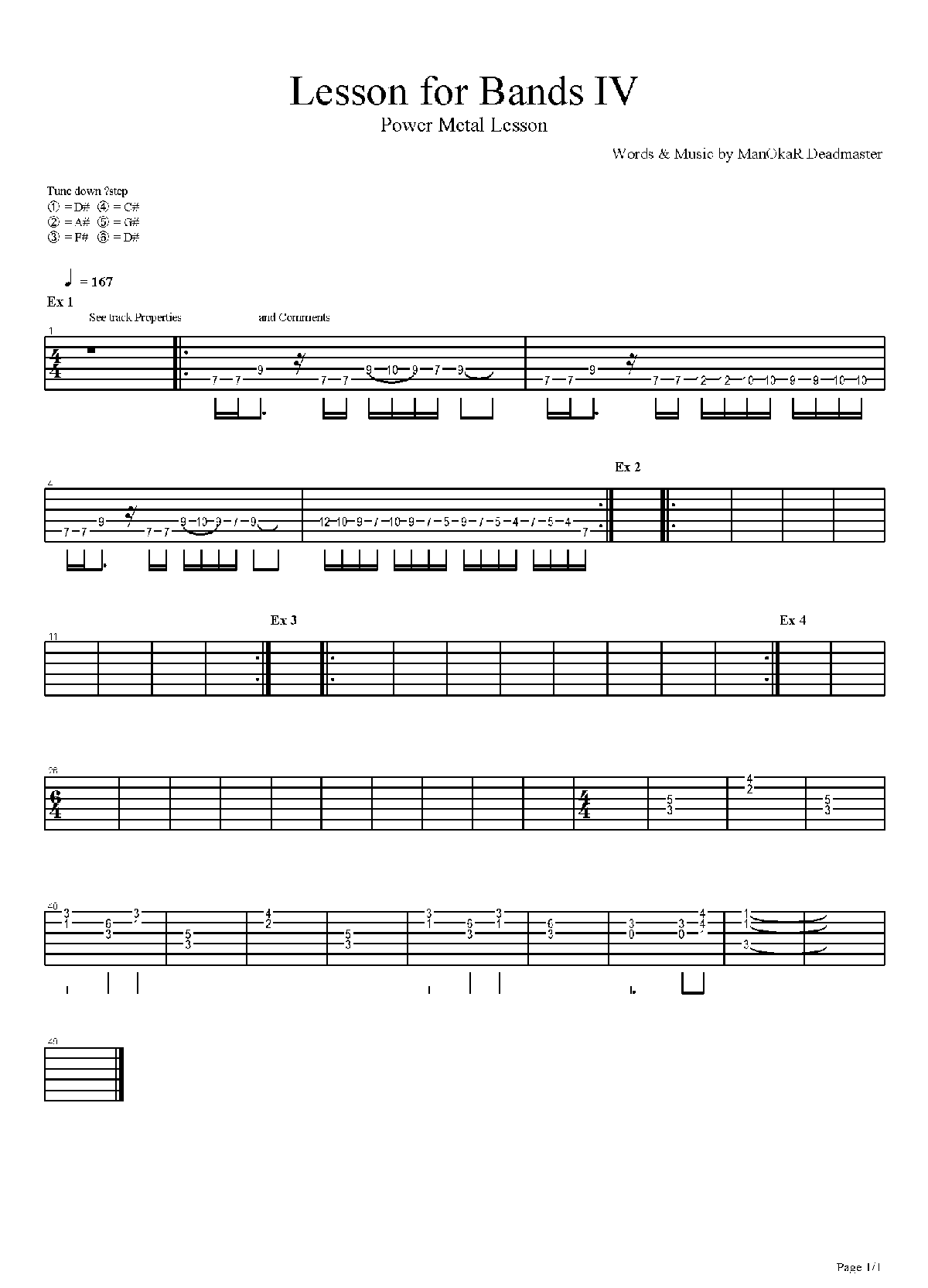 电吉他练习谱《Heavy Metal Guitar School - Lesson For Bands IV》简谱五线谱附歌词是飞鱼乐谱网于2017年04月02日 10:16:10整理更新,内容收录在电吉他乐谱栏目;飞鱼乐谱网免费分享专业、准确、规范、高清的电吉他乐谱简谱五线谱歌词等电子版资料,欢迎在线免费下载;飞鱼乐谱网无需注册会员,即可直接免费下载各类乐器学习相关资源。