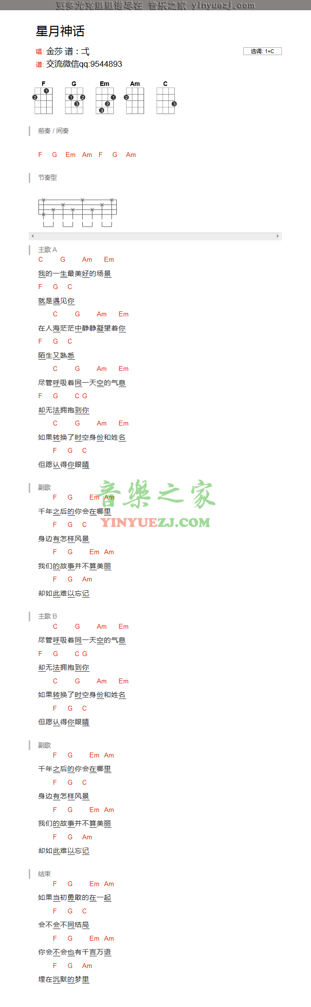 星月神话尤克里里谱_金莎_C调尤克里里弹唱谱