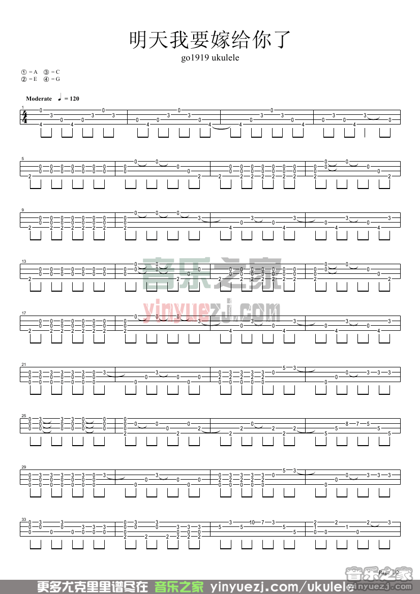 明天我要嫁给你了尤克里里指弹谱,许茹芸的一首尤克里里指弹曲目,这首曲子采用的是标准调弦,4/4拍的节奏,无需特殊调音。演奏时可不夹变调夹,曲谱由飞鱼曲谱更新上传,共2张高清图片尤克里里指弹谱例,曲谱来源于网络转载,编配制谱者暂不详。
