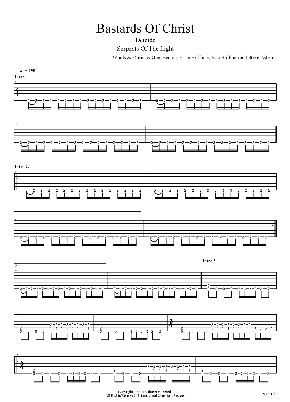 电吉他练习谱《Deicide - Bastards Of Christ》简谱五线谱附歌词是飞鱼乐谱网于2017年04月01日 18:19:53整理更新,内容收录在电吉他乐谱栏目;飞鱼乐谱网免费分享专业、准确、规范、高清的电吉他乐谱简谱五线谱歌词等电子版资料,欢迎在线免费下载;飞鱼乐谱网无需注册会员,即可直接免费下载各类乐器学习相关资源。
