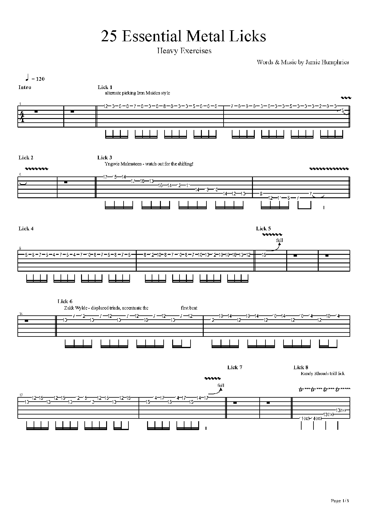 电吉他练习谱《Heavy Exercises - 25 Essential Metal Licks》简谱五线谱附歌词是飞鱼乐谱网于2017年04月01日 20:59:28整理更新,内容收录在电吉他乐谱栏目;飞鱼乐谱网免费分享专业、准确、规范、高清的电吉他乐谱简谱五线谱歌词等电子版资料,欢迎在线免费下载;飞鱼乐谱网无需注册会员,即可直接免费下载各类乐器学习相关资源。