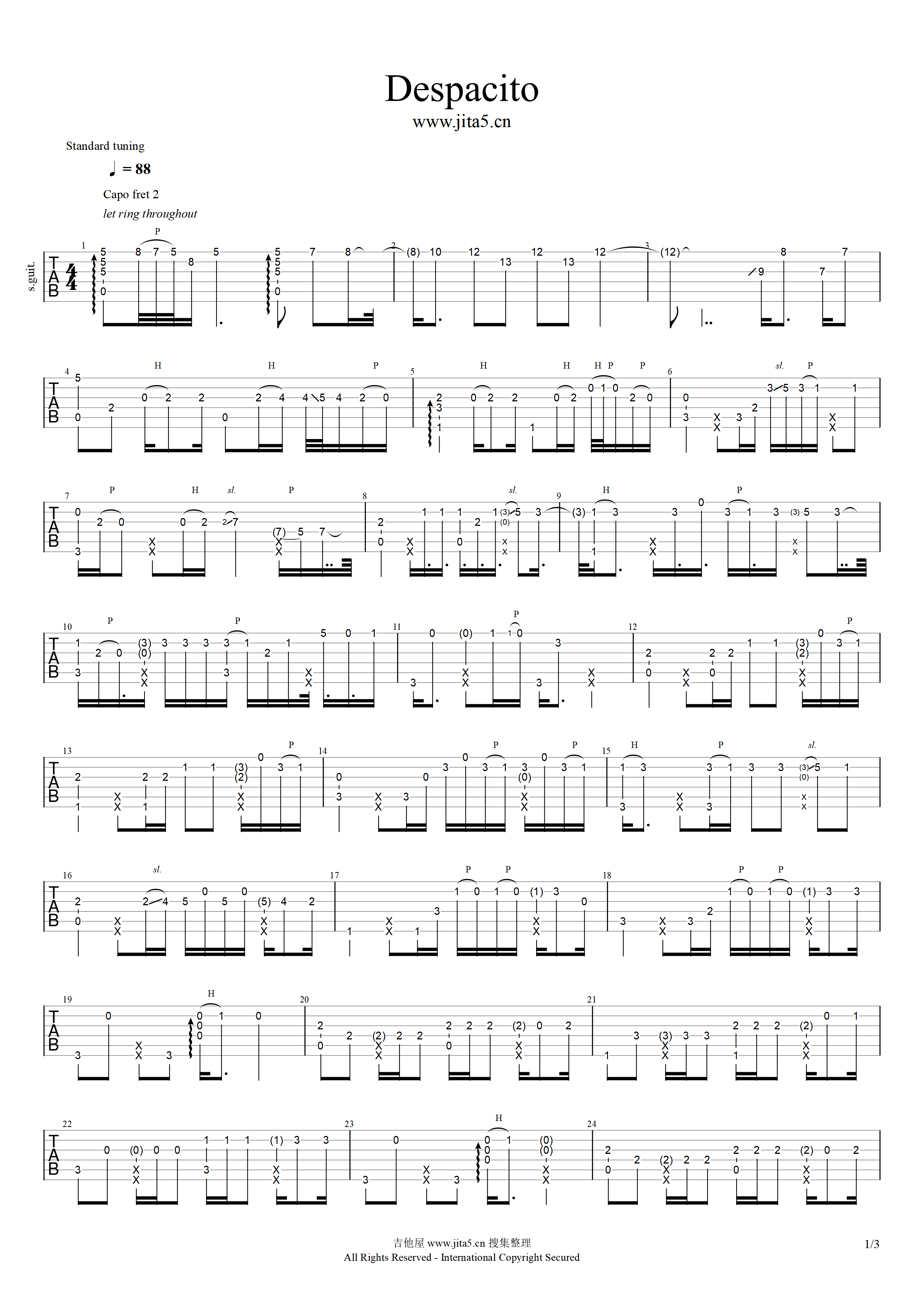 Despacito指弹吉他谱,曲子为标准调弦的指弹曲,此版本的曲谱来源于@网络转载,为4/4拍的节奏,共3张高清吉他谱,变调夹2品为原曲子的调式,演奏时可按个人需求选择合适的变调夹位置。