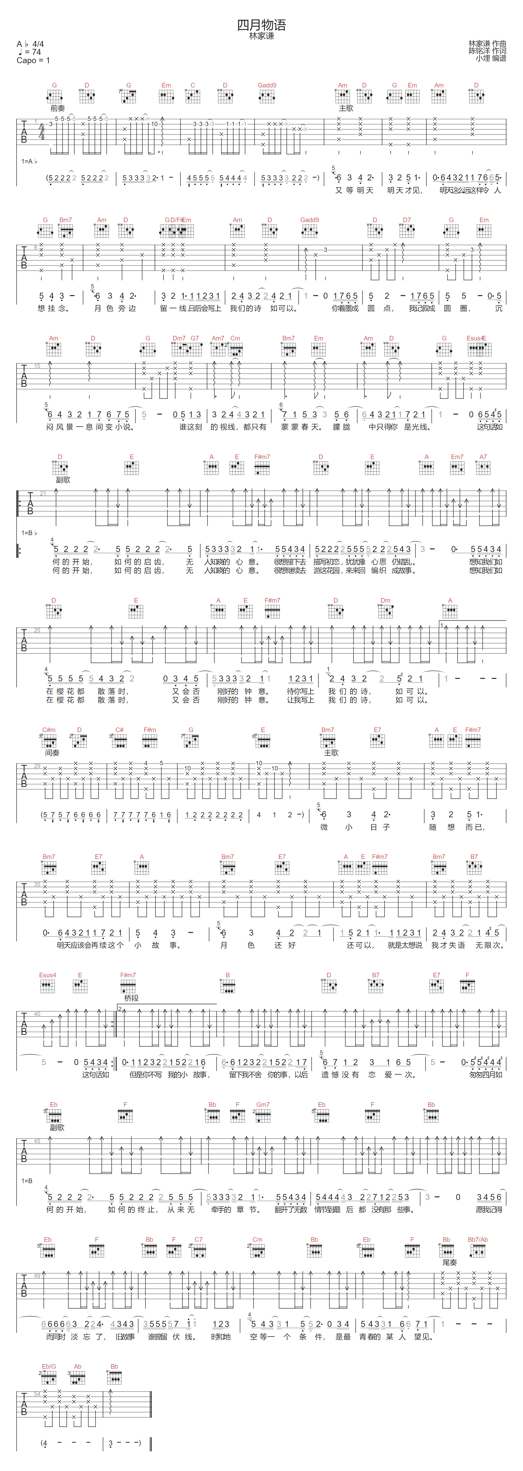 四月物语吉他谱_林家谦_C调原版弹唱谱_图片六线谱