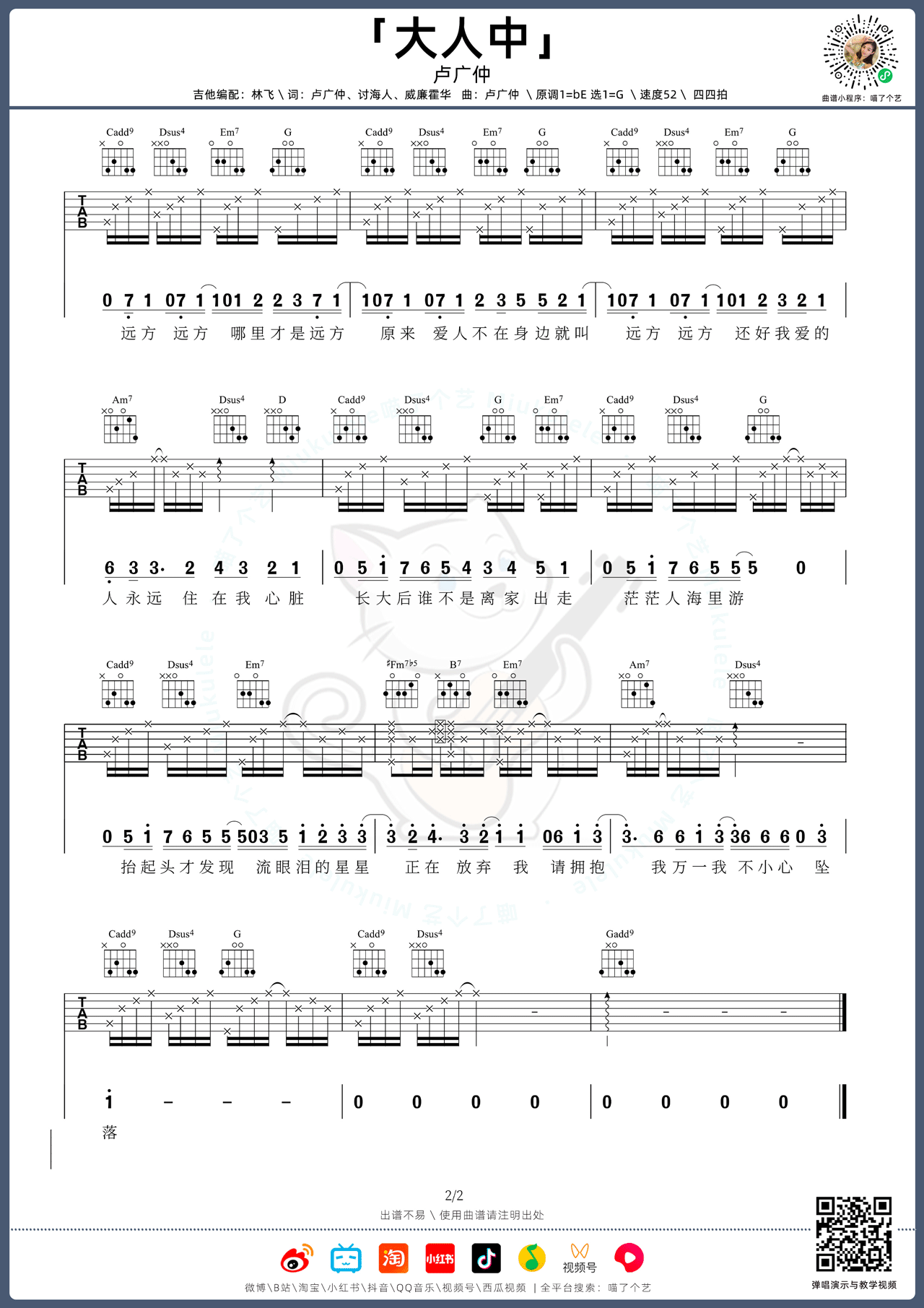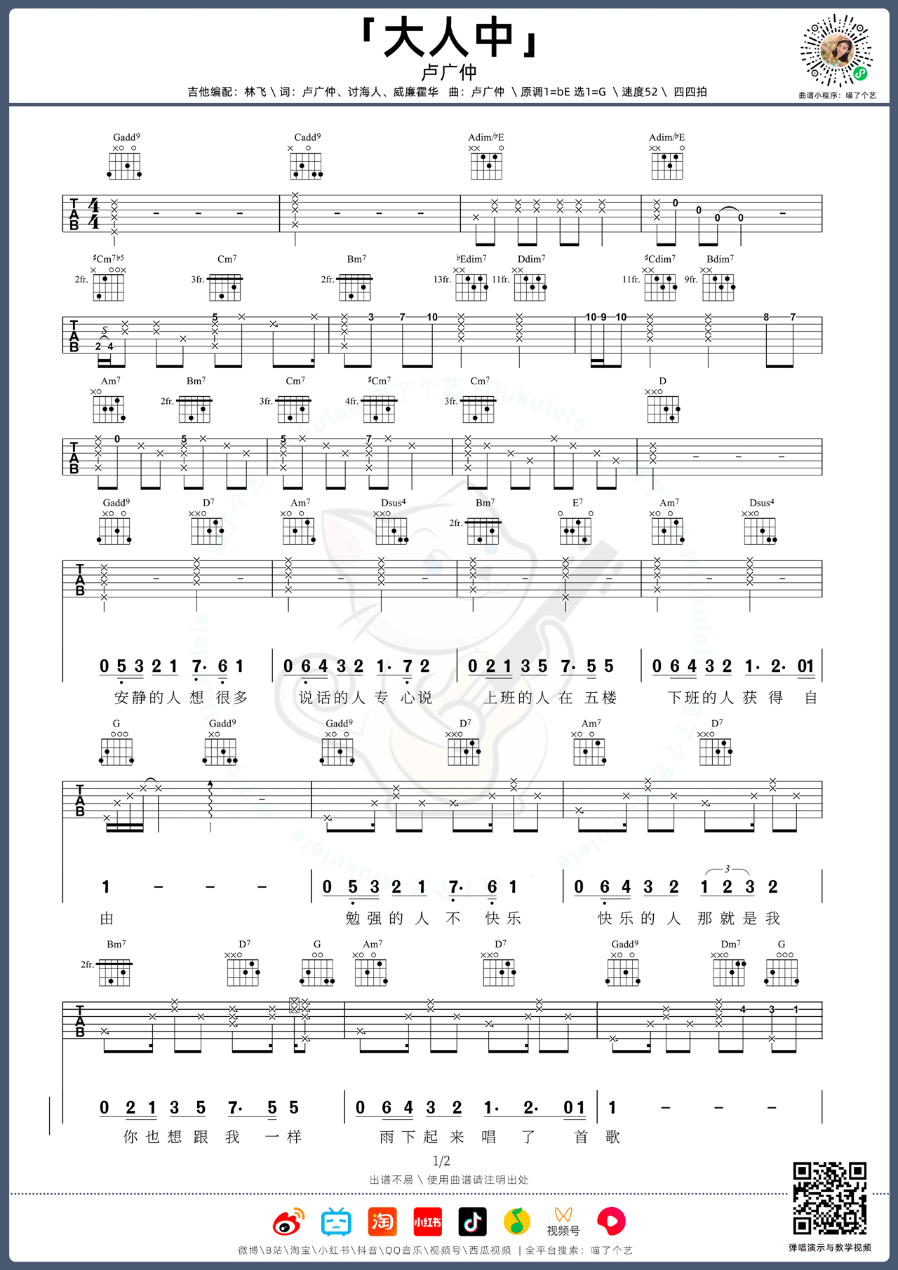 大人中吉他谱,歌曲原调为降E调,此版本的曲谱来源于@喵了个艺,为4/4拍的节奏,按G调指法编配,共2张高清吉他谱,变调夹根据个人情况选择为原歌曲的调式,演唱时可按个人音域选择合适的变调夹位置。