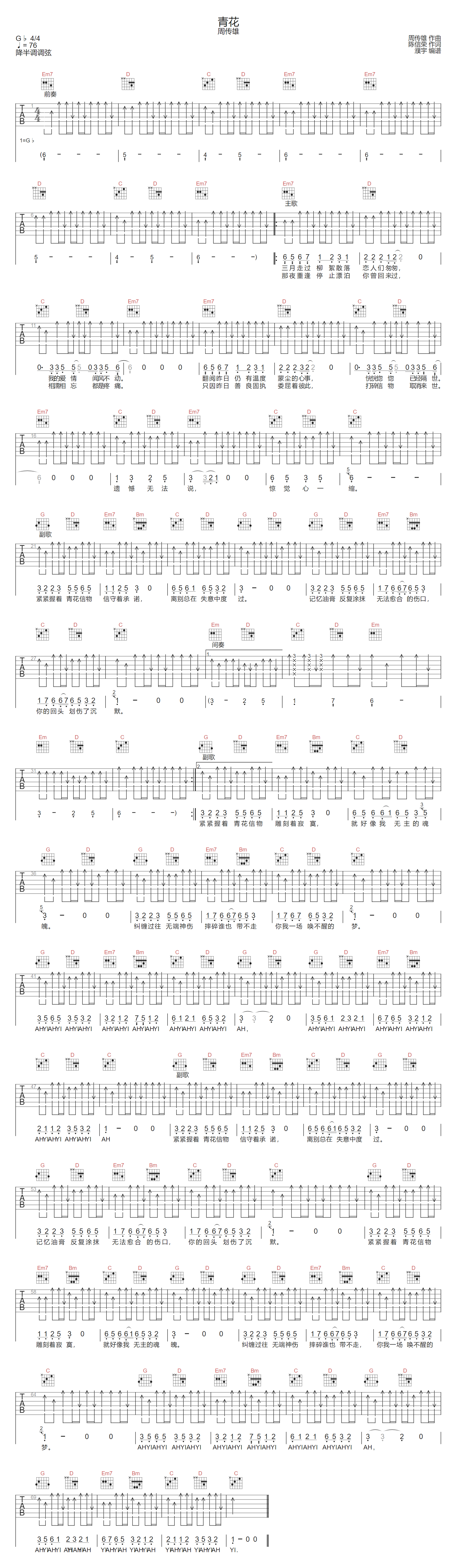 青花吉他谱,歌曲原调为#F调,此版本的曲谱来源于@濮宇,为4/4拍的节奏,按G调指法编配,共1张高清吉他谱,变调夹降半音调弦为原歌曲的调式,演唱时可按个人音域选择合适的变调夹位置。