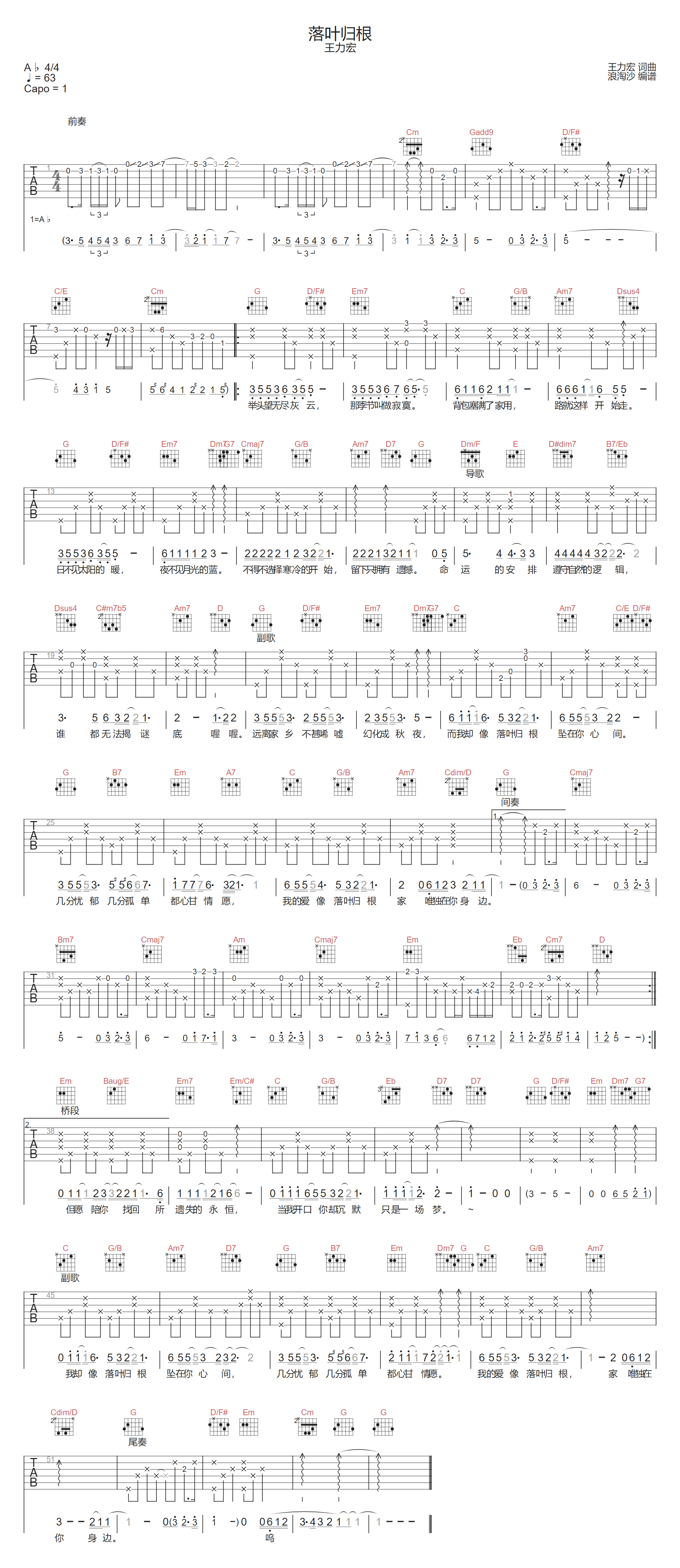 落叶归根吉他谱,歌曲原调为降A调,此版本的曲谱来源于@浪淘沙,为4/4拍的节奏,按G调指法编配,共1张高清吉他谱,变调夹1品为原歌曲的调式,演唱时可按个人音域选择合适的变调夹位置。