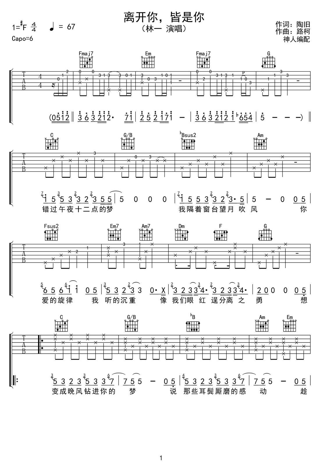 离开你皆是你吉他谱_林一_C调原版弹唱谱_图片六线谱