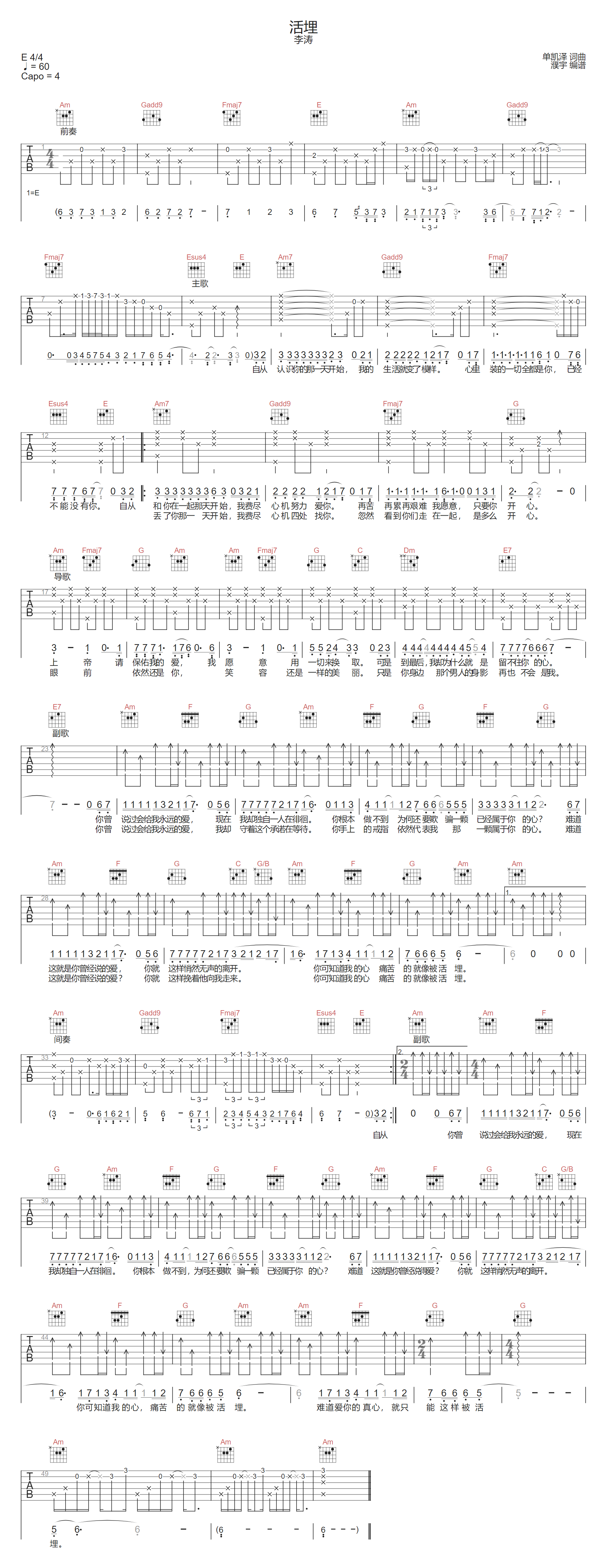 活埋吉他谱,歌曲原调为E调,此版本的曲谱来源于@濮宇,为4/4拍的节奏,按C调指法编配,共1张高清吉他谱,变调夹4品为原歌曲的调式,演唱时可按个人音域选择合适的变调夹位置。