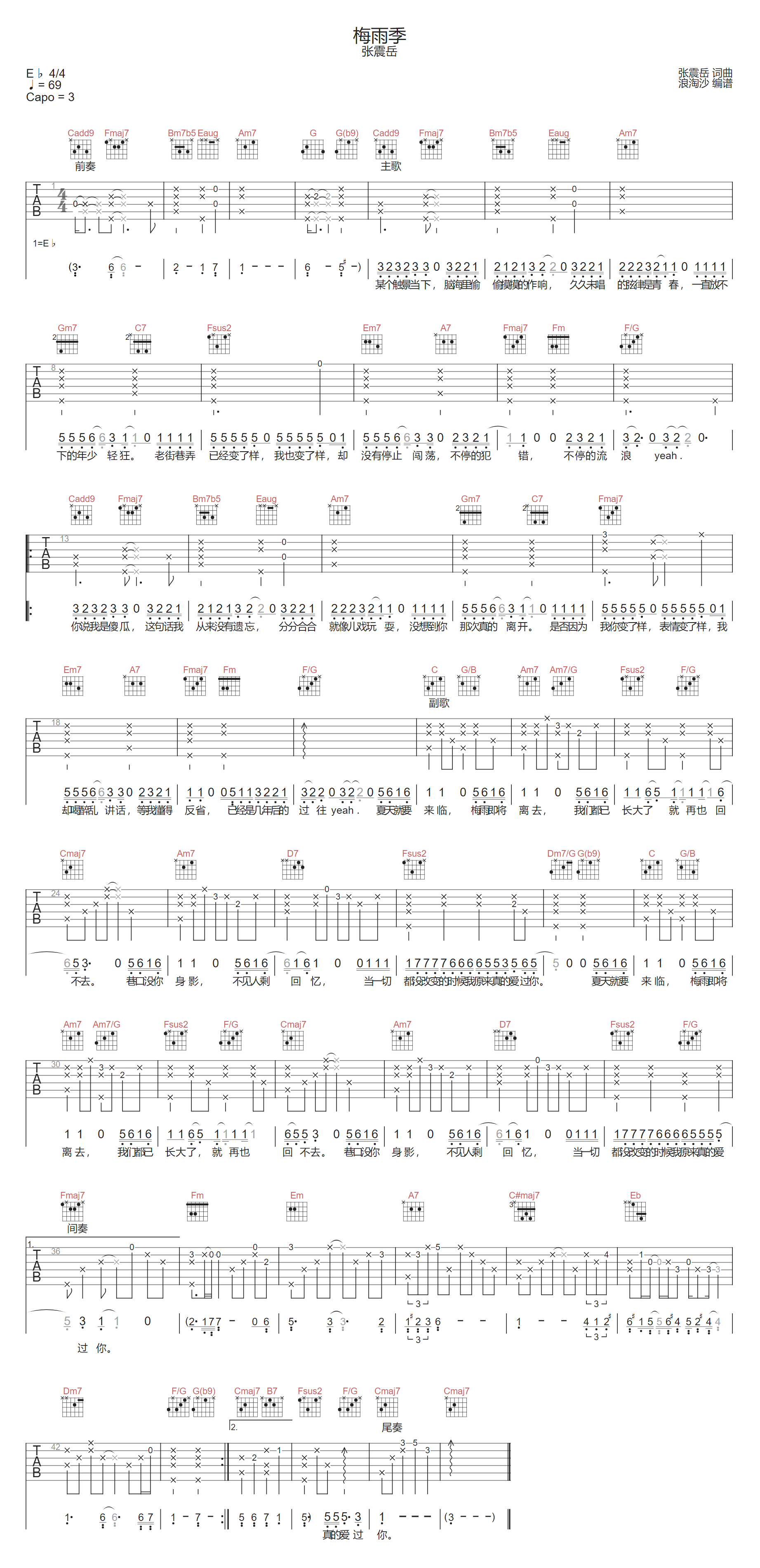 梅雨季吉他谱,歌曲原调为降E调,此版本的曲谱来源于@浪淘沙,为4/4拍的节奏,按C调指法编配,共1张高清吉他谱,变调夹3品为原歌曲的调式,演唱时可按个人音域选择合适的变调夹位置。