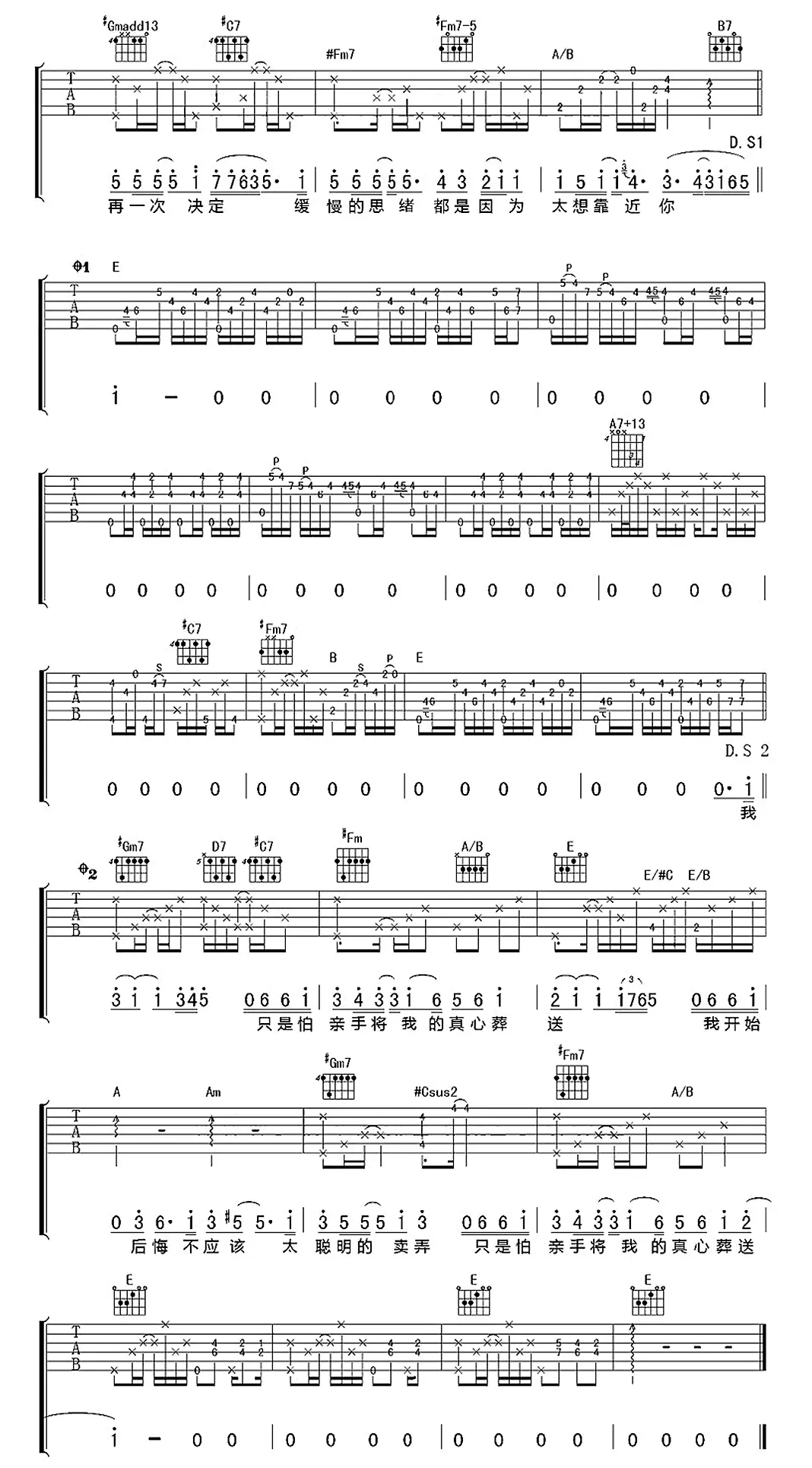 太聪明吉他谱,歌曲原调为E调,此版本的曲谱来源于@吉他专家,为4/4拍的节奏,按E调指法编配,共3张高清吉他谱,变调夹不夹为原歌曲的调式,演唱时可按个人音域选择合适的变调夹位置。