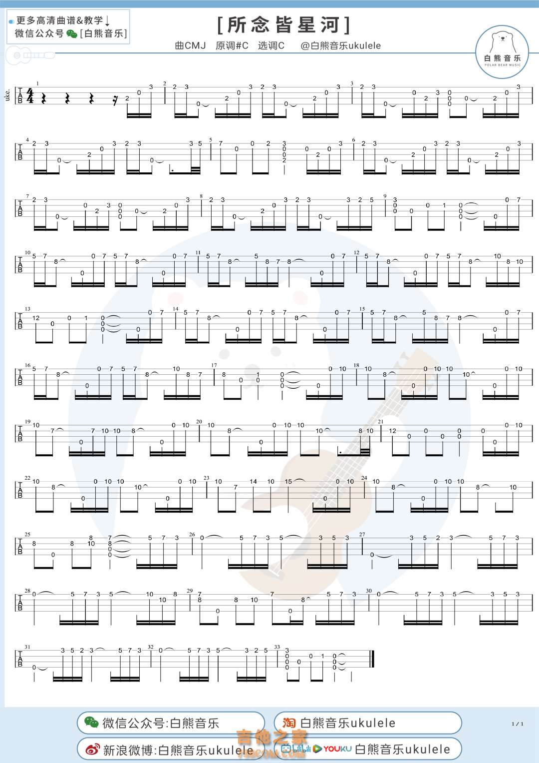 CMJ/房东的猫《所念皆星河》尤克里里指弹谱及教学视频 白熊音乐 ... - 尤克里里谱