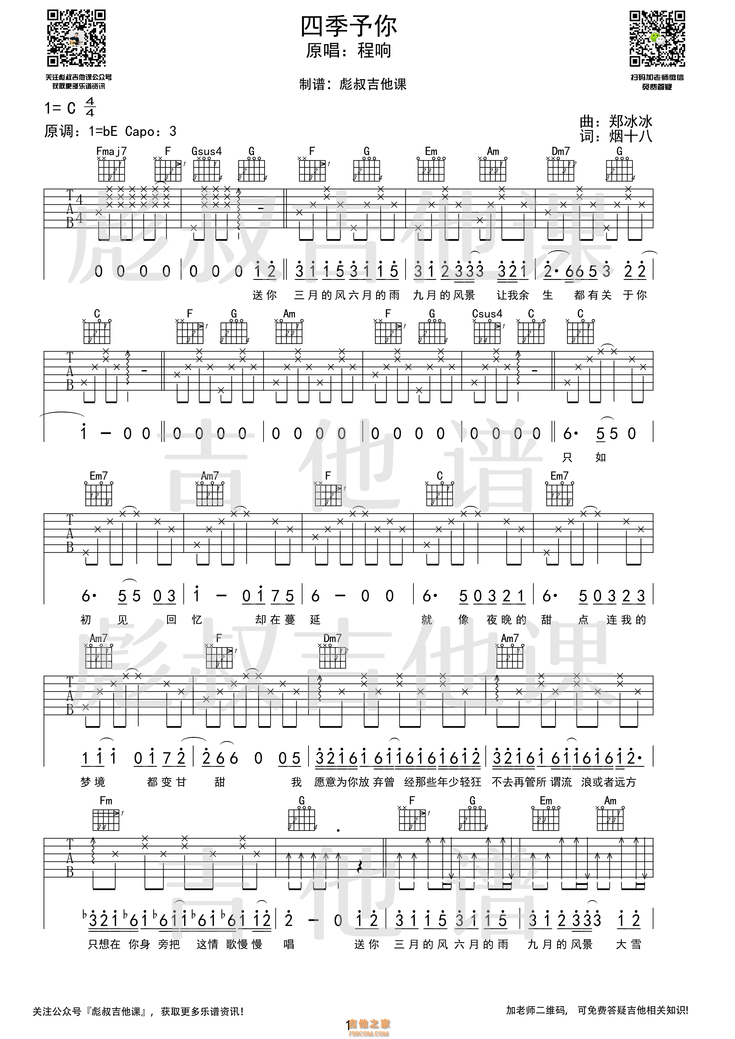 程响—《四季予你》C调弹唱六线谱 彪叔吉他课制谱 - 吉他谱