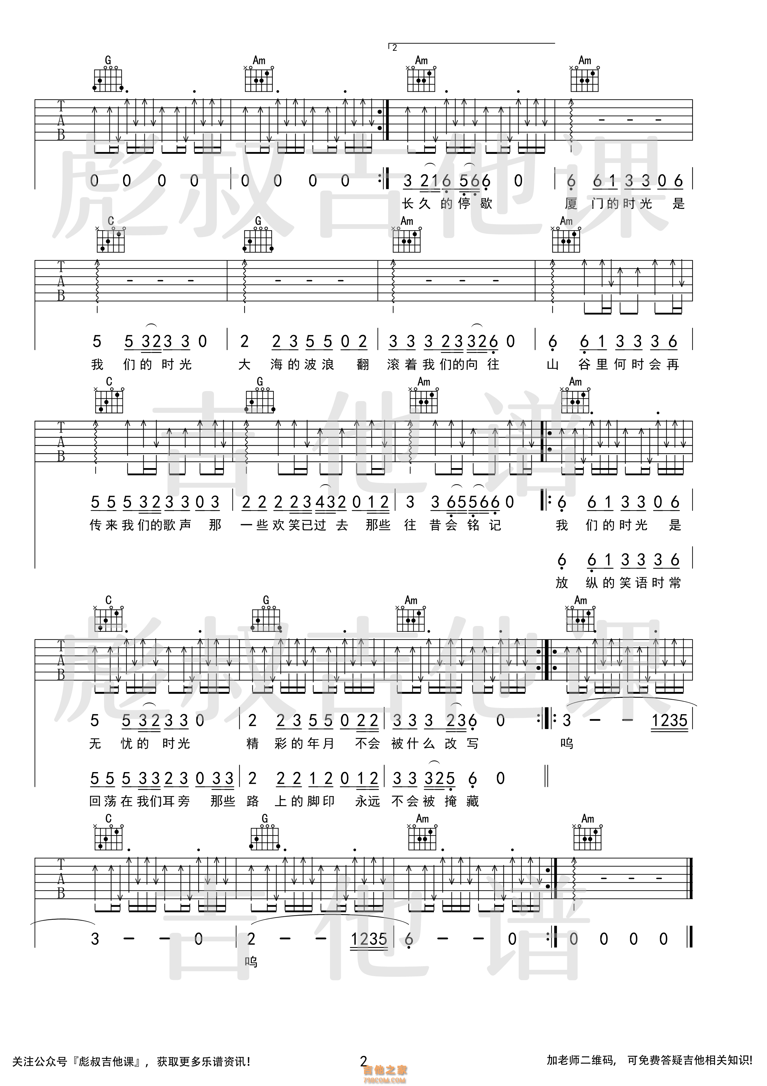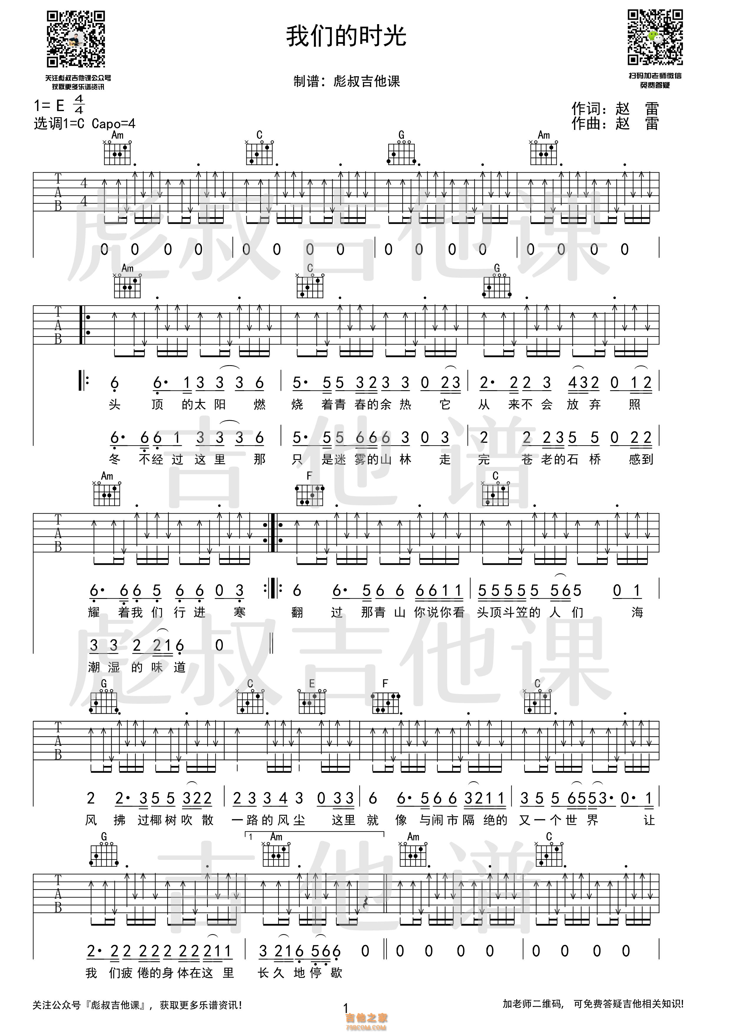 赵雷—《我们的时光》C调弹唱六线谱 彪叔吉他课制谱 - 吉他谱