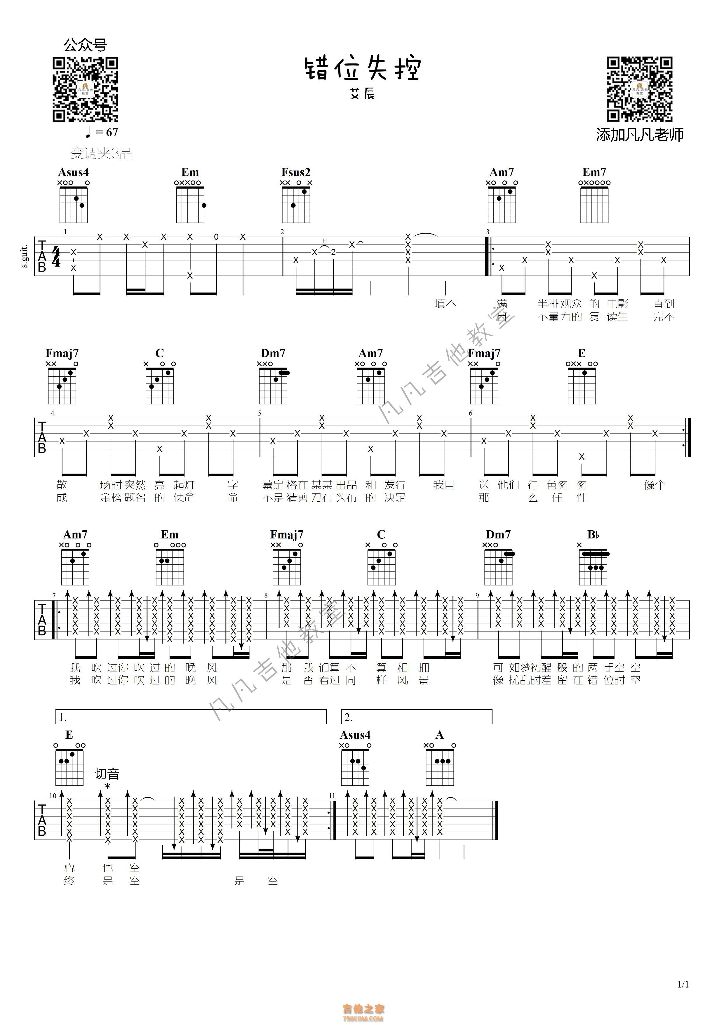 吉他弹唱「错位时空」艾辰,免费吉他谱,简单版。郝浩涵式、32分音符、快速切音扫弦。 ... - 吉他谱