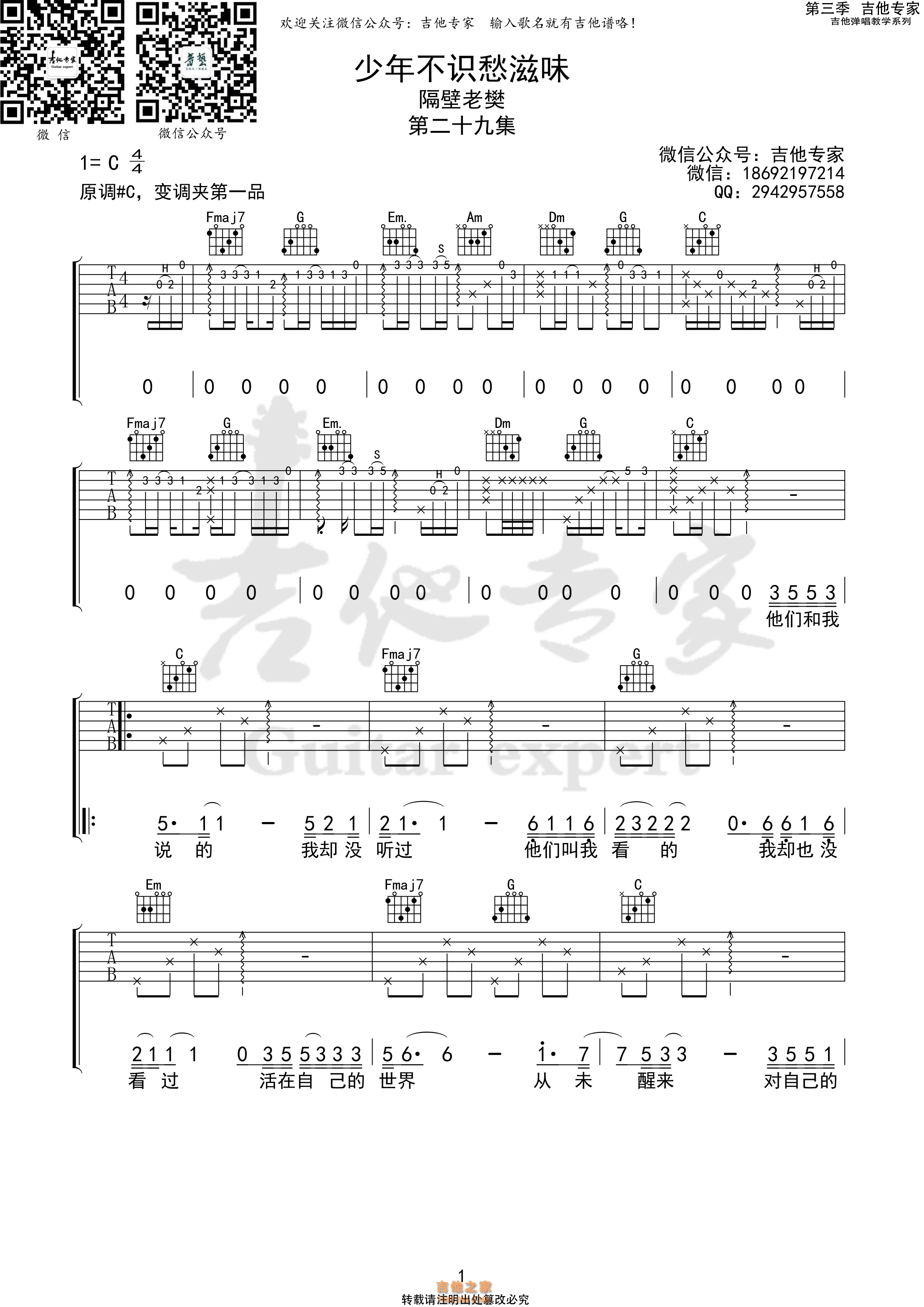 少年不识愁滋味 隔壁老樊原版吉他谱 - 吉他谱