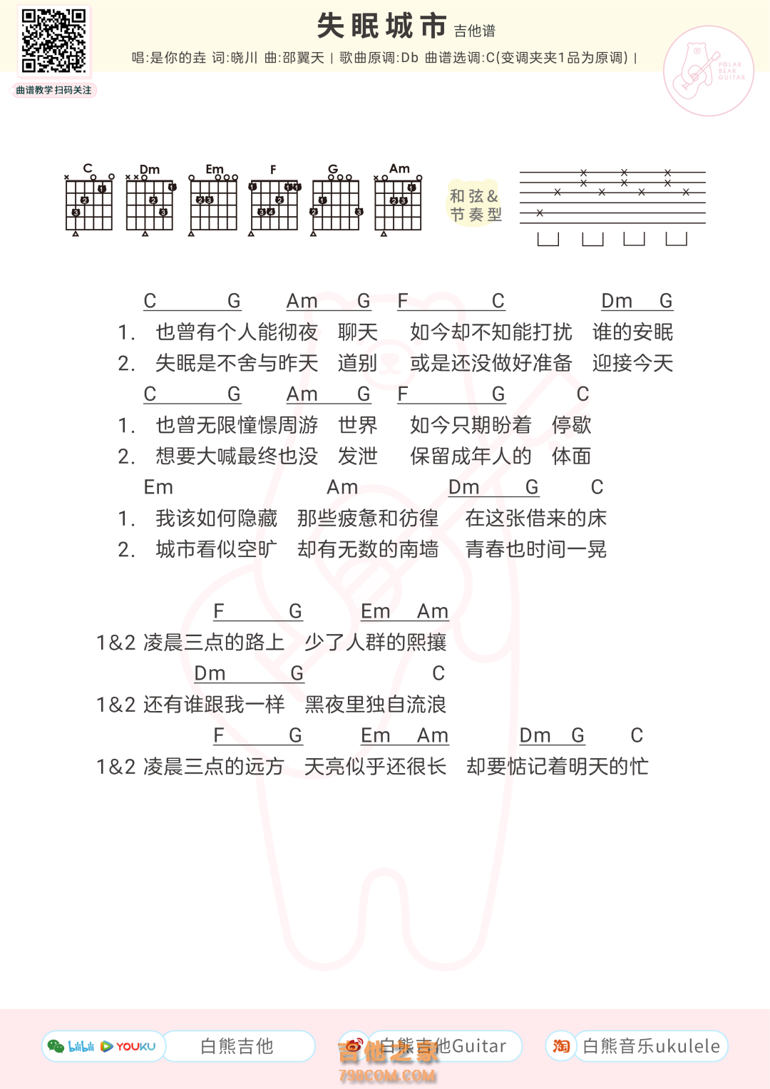 是你的垚《失眠城市》吉他弹唱谱 白熊音乐 - 吉他谱