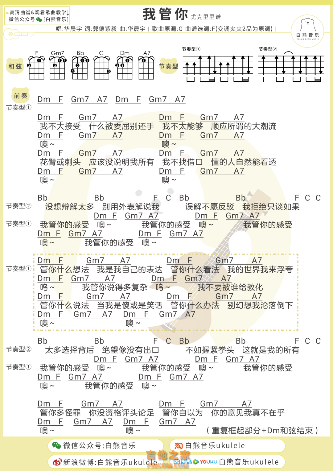 华晨宇《我管你》尤克里里弹唱谱及教学视频 白熊音乐 - 尤克里里谱