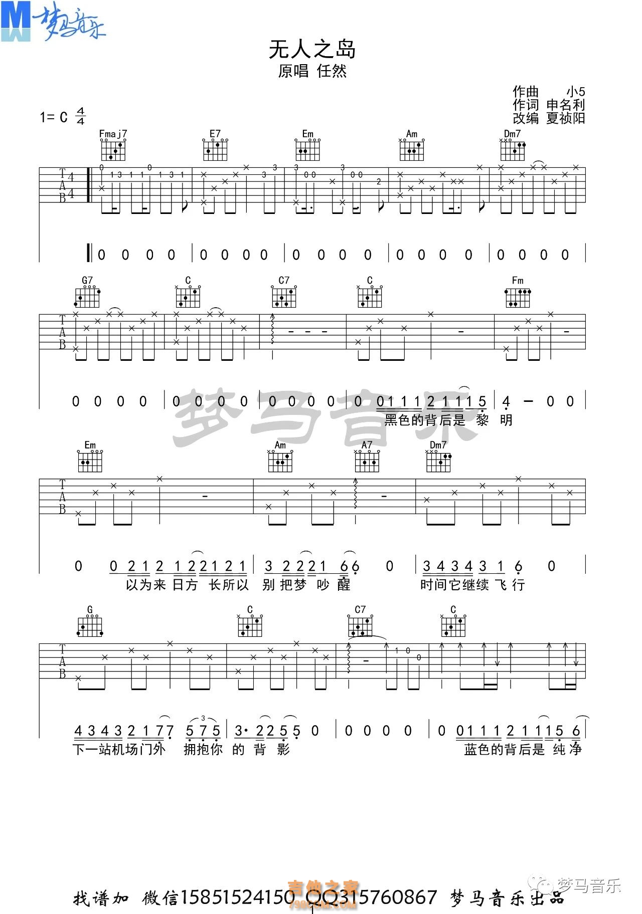 [无人之岛吉他谱]任然 无人之岛吉他谱C调 梦马音乐 - C调吉他谱大全