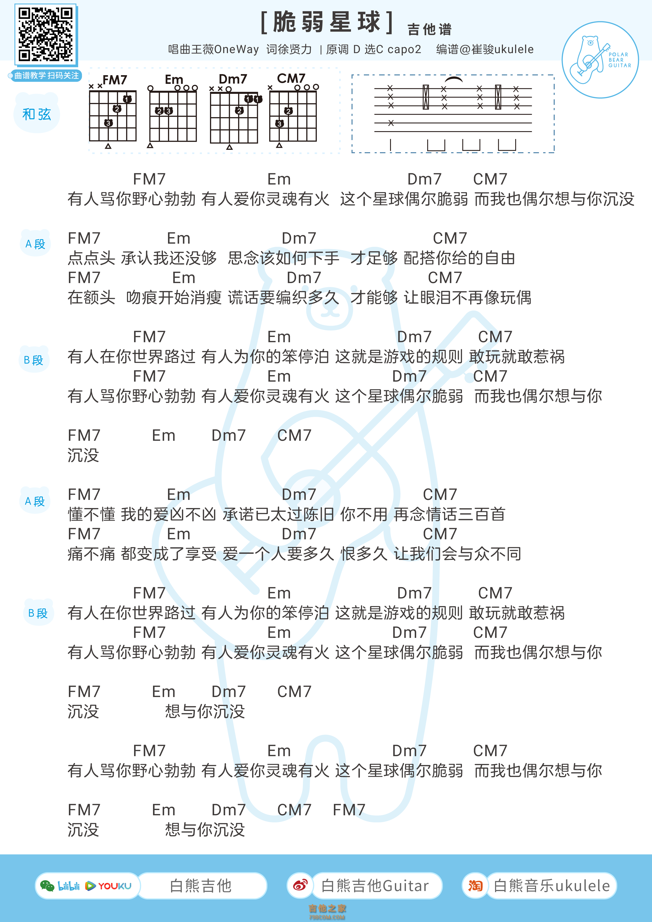 王薇OneWay/杨胖雨《脆弱星球》吉他谱及歌词 白熊音乐 - 吉他谱