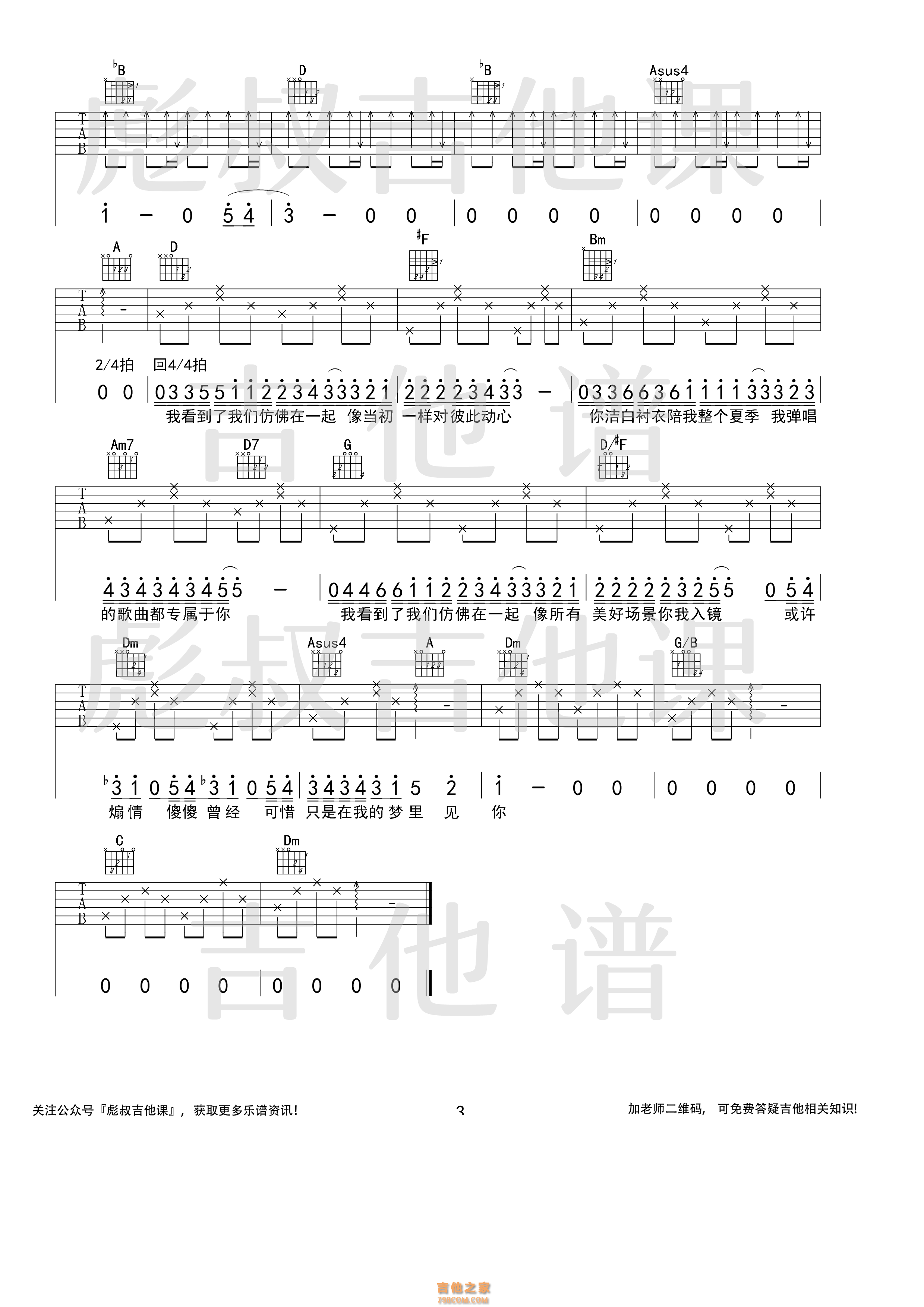 街角的晚风吉他谱,歌曲原调为降B调,此版本的曲谱来源于@网络转载,为4/4拍的节奏,按G调指法编配,共2张高清吉他谱,变调夹3品为原歌曲的调式,演唱时可按个人音域选择合适的变调夹位置。 歌曲表达了对逝去爱情的不舍与矛盾,想靠近回忆又怕受伤,藏着爱而不得的… -