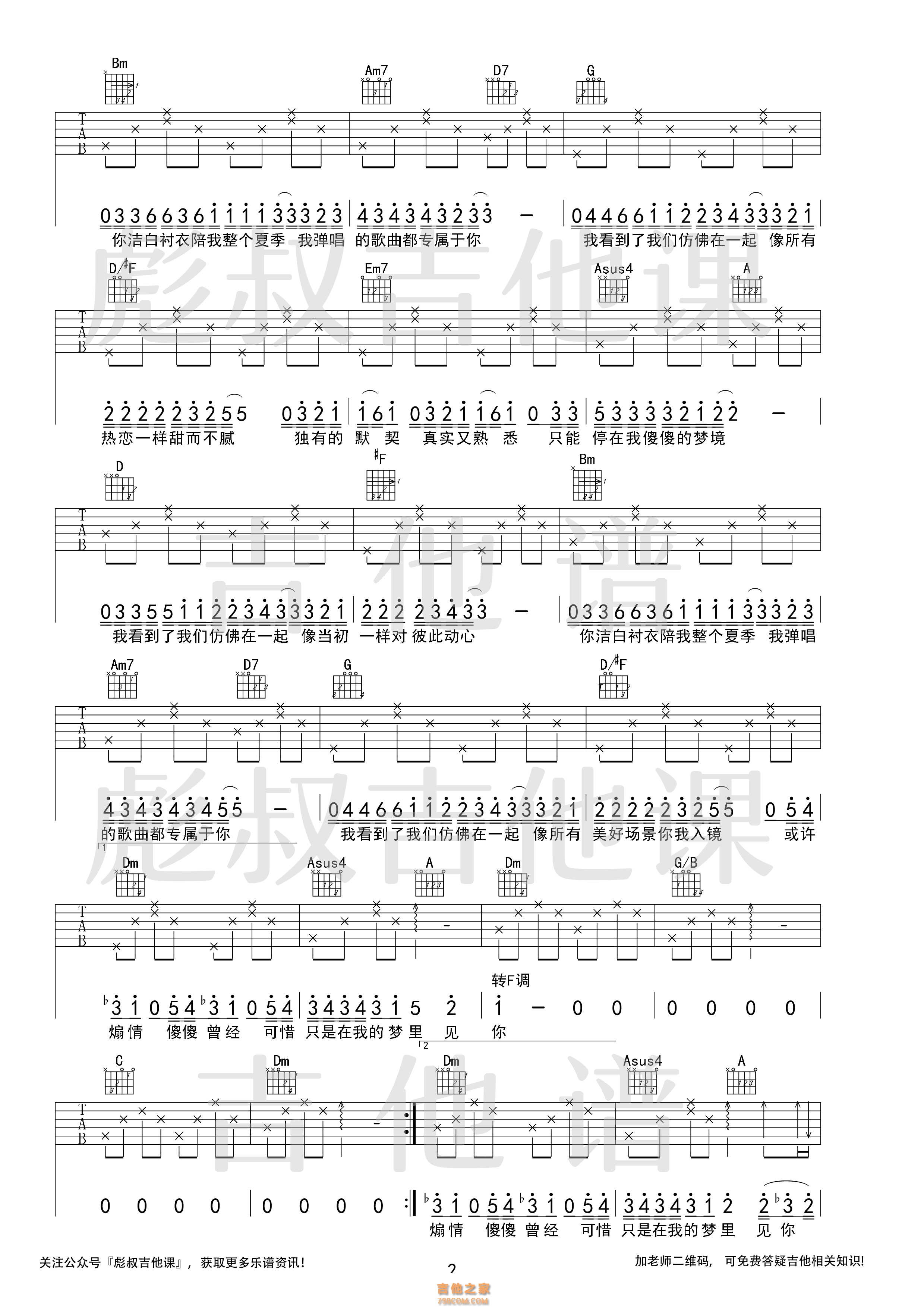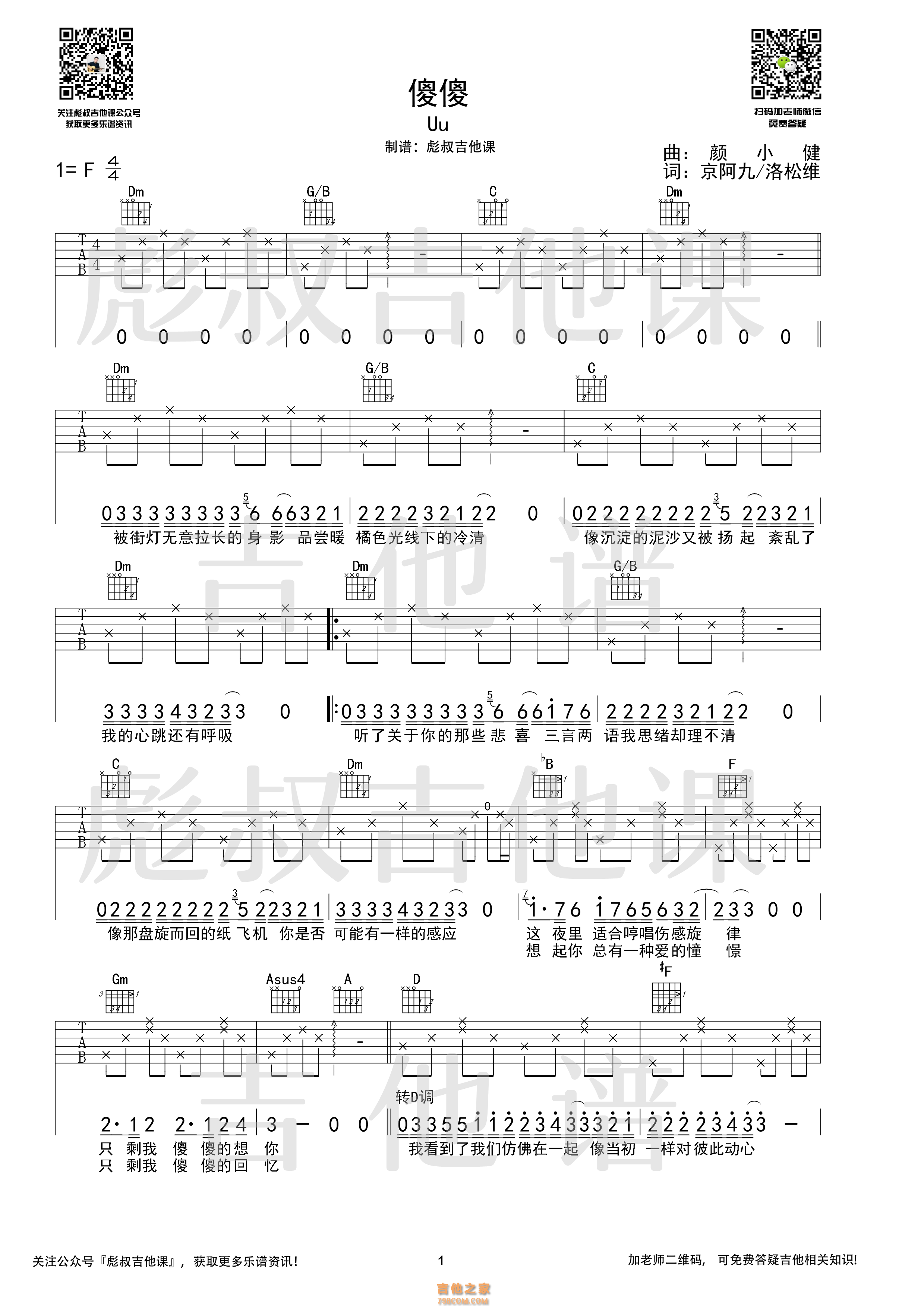 Uu—《傻傻》 F调弹唱六线谱 彪叔吉他课制谱 - 吉他谱