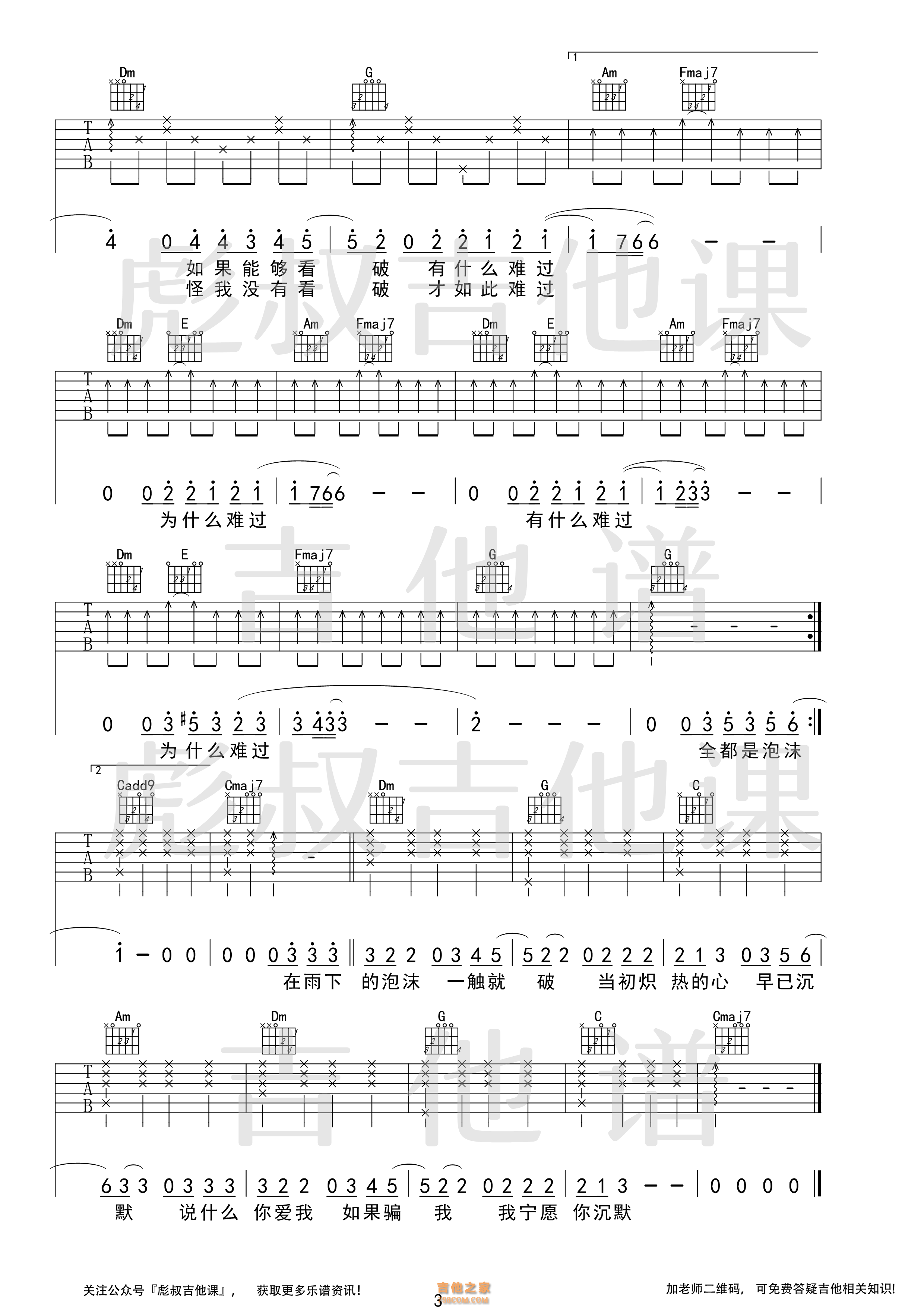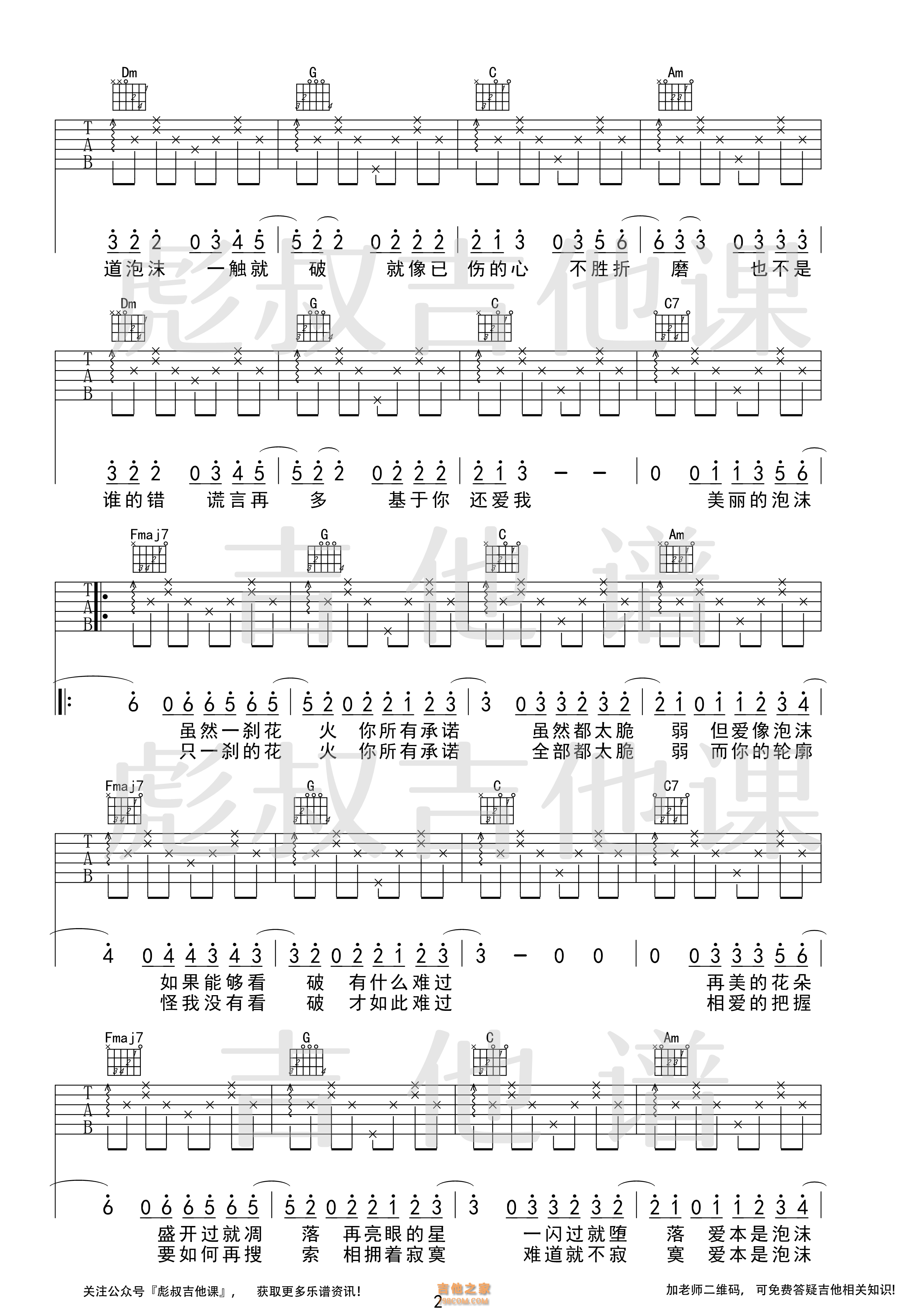 邓紫棋—《泡沫》C调弹唱六线谱 彪叔吉他课制谱 - 吉他谱