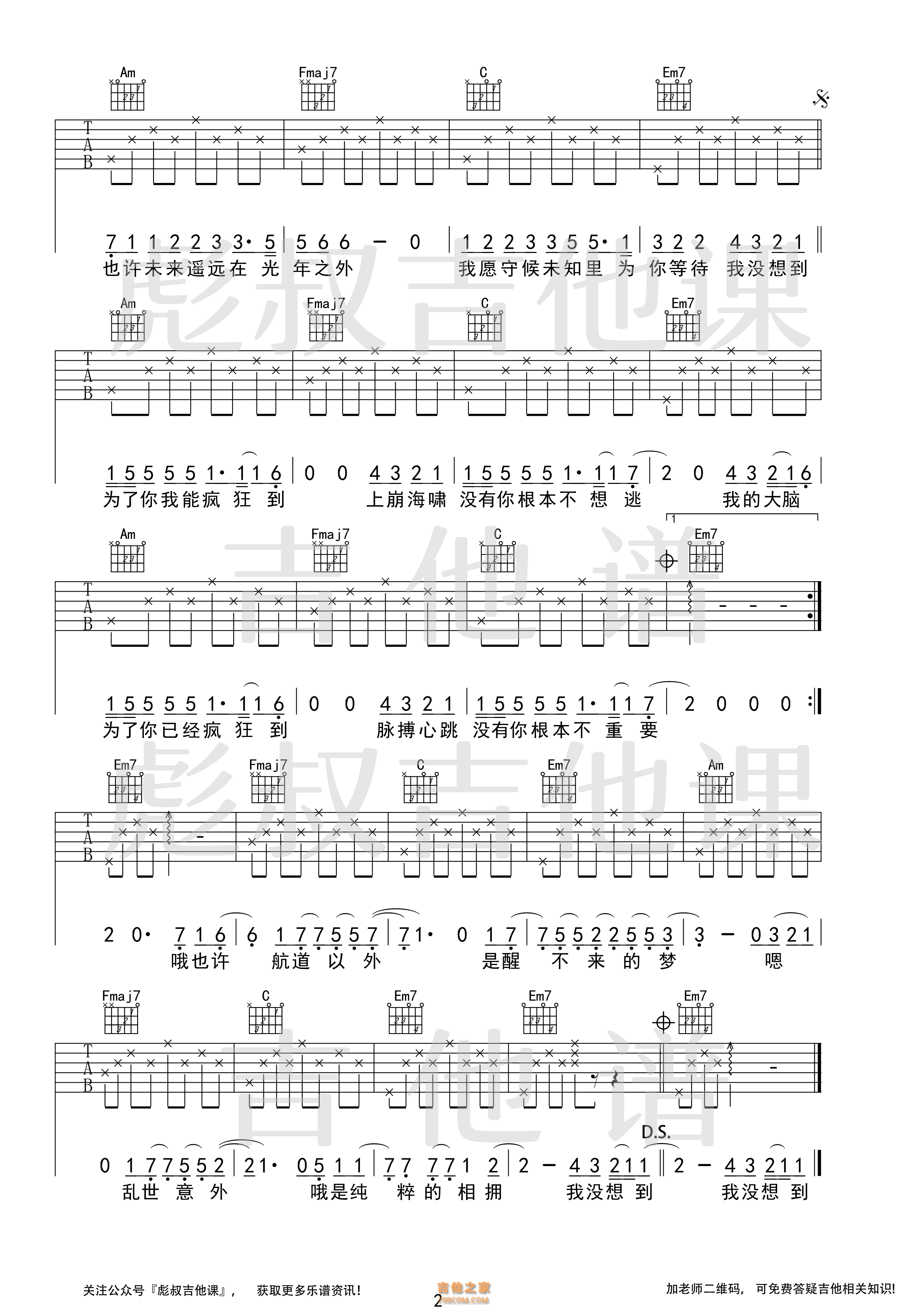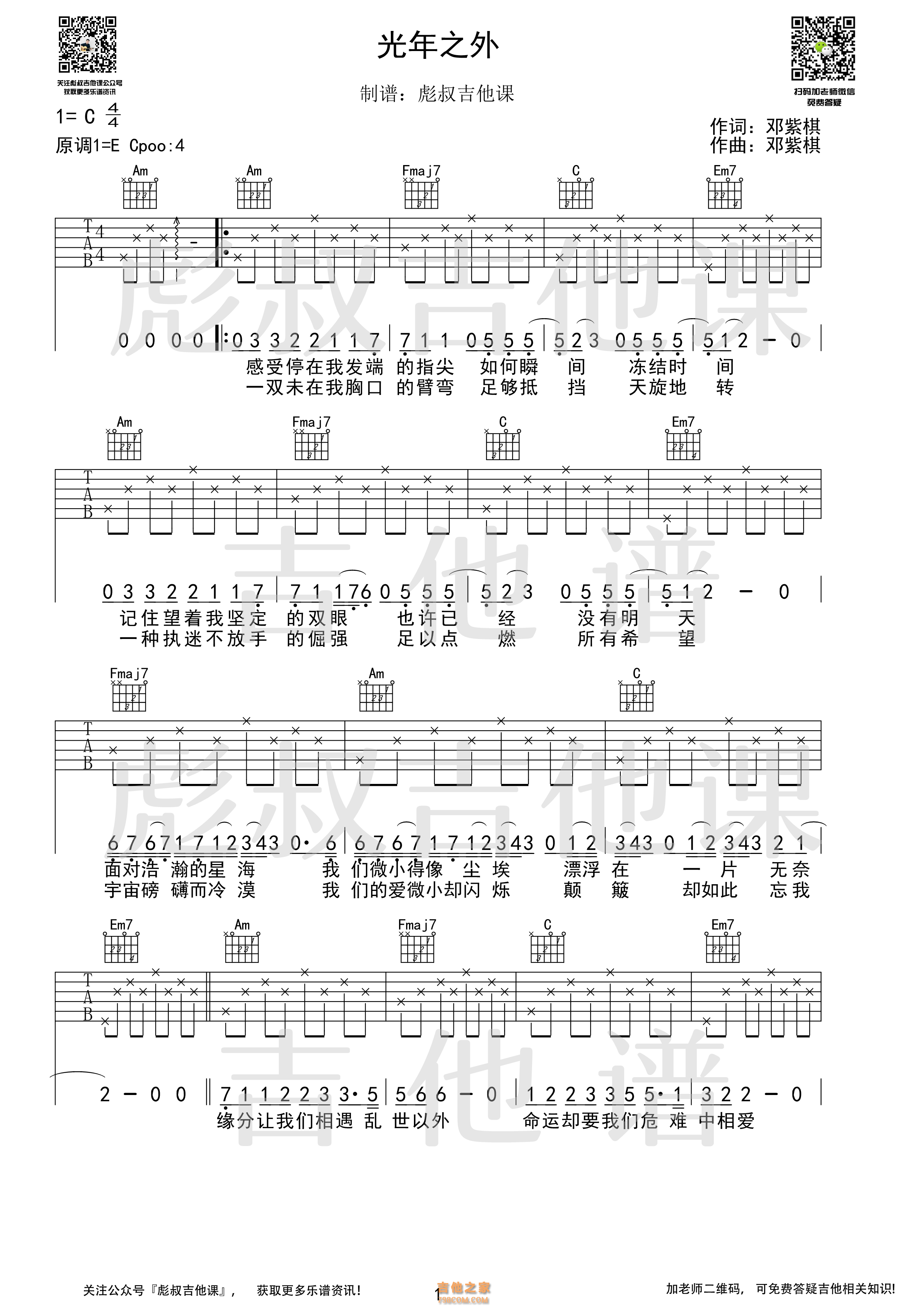 邓紫棋—《光年之外》C调弹唱六线谱 彪叔吉他课制谱 - 吉他谱