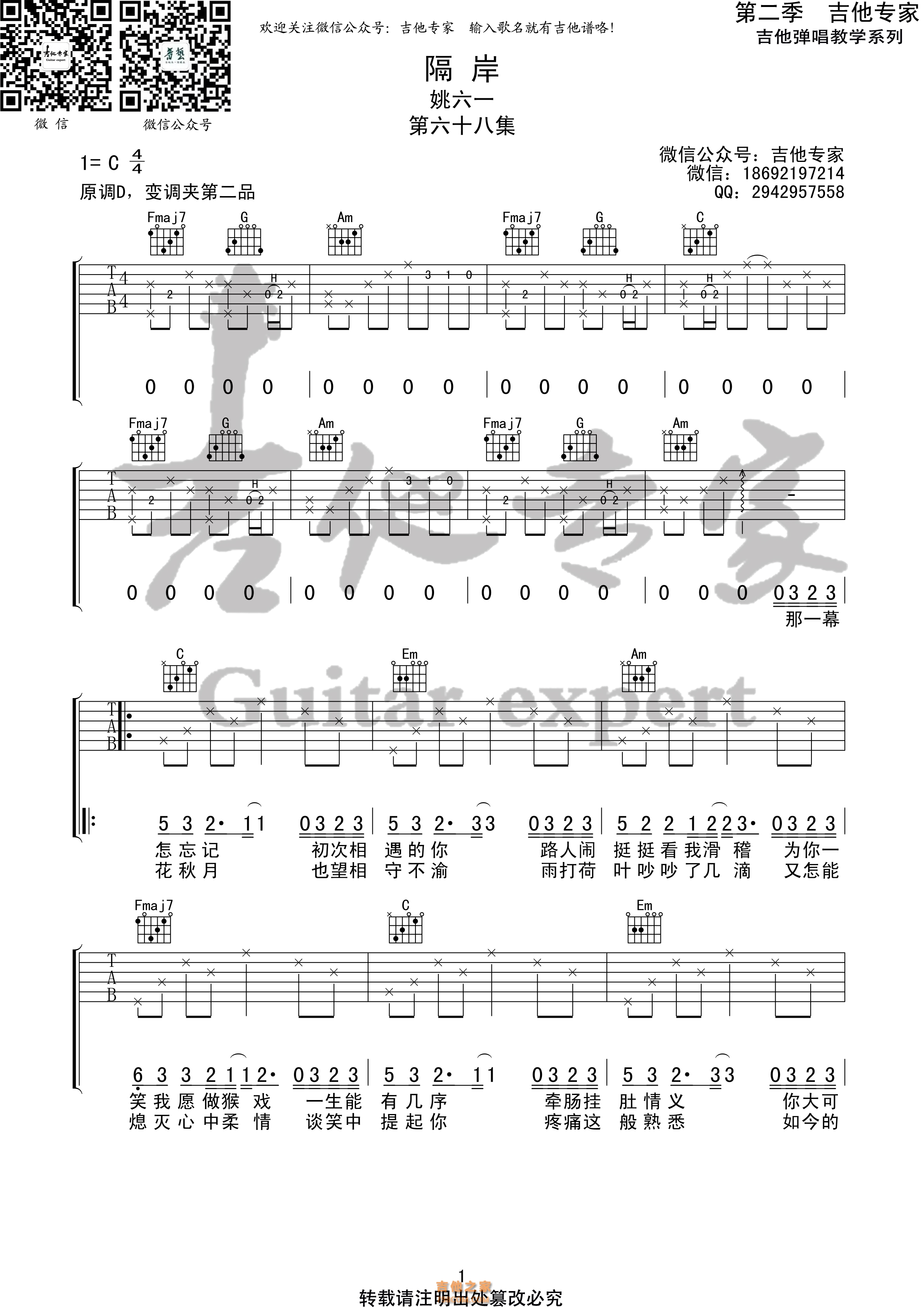 隔岸 姚六一原版吉他谱 - 吉他谱