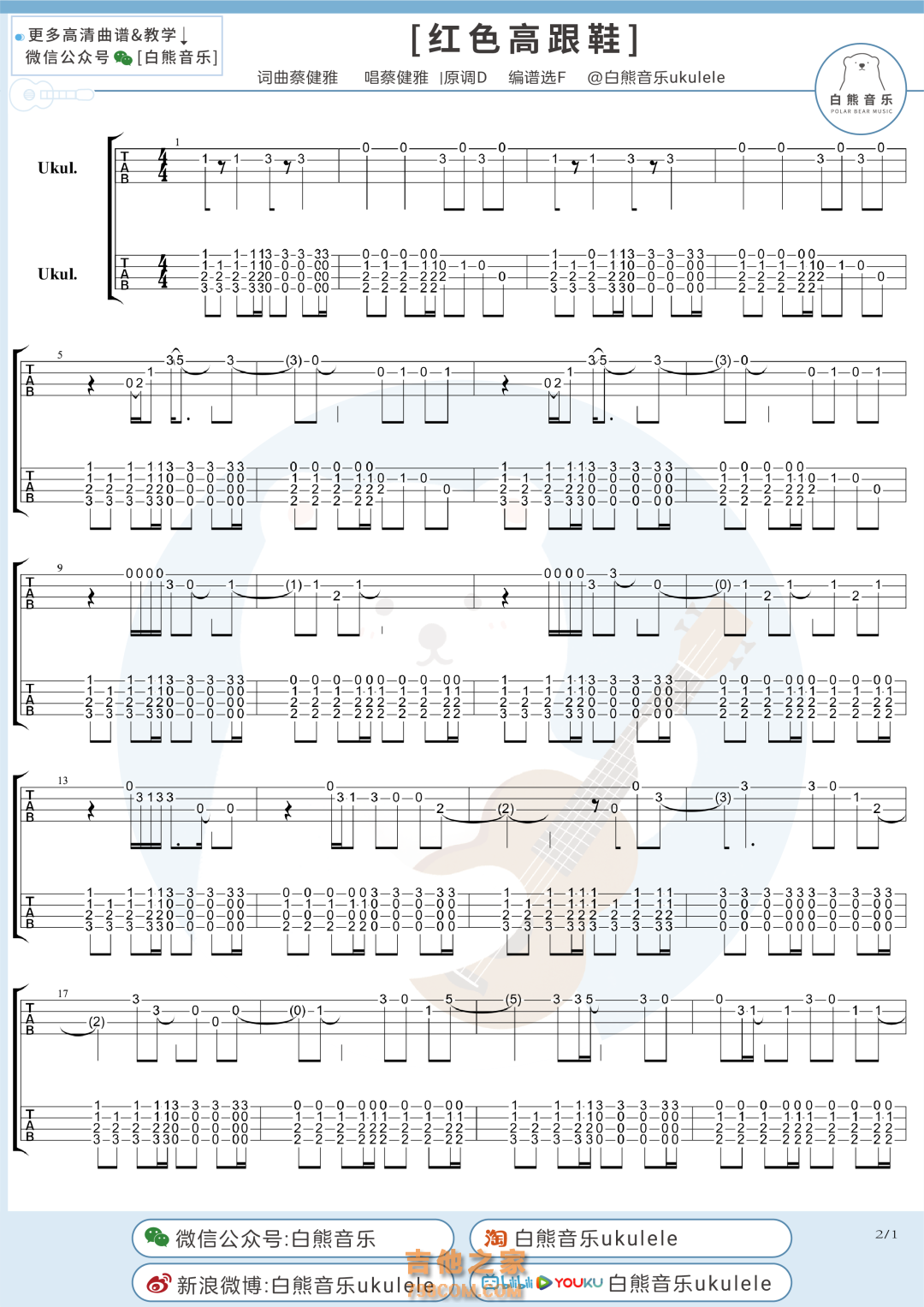 蔡健雅《红色高跟鞋》尤克里里指弹谱及教学视频 白熊音乐 - 尤克里里谱