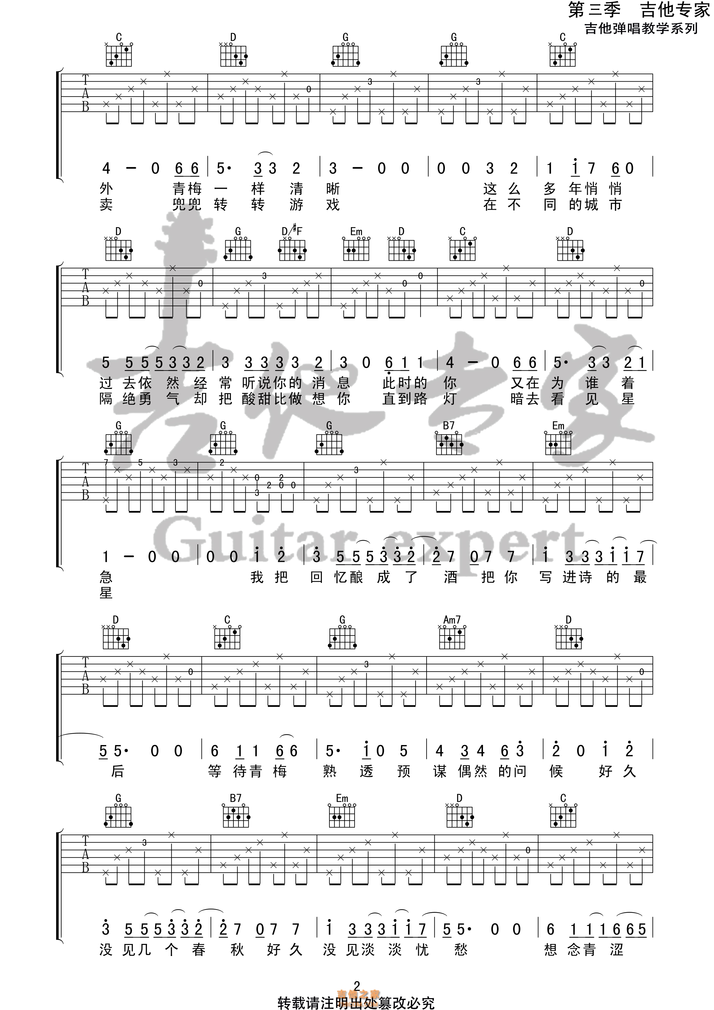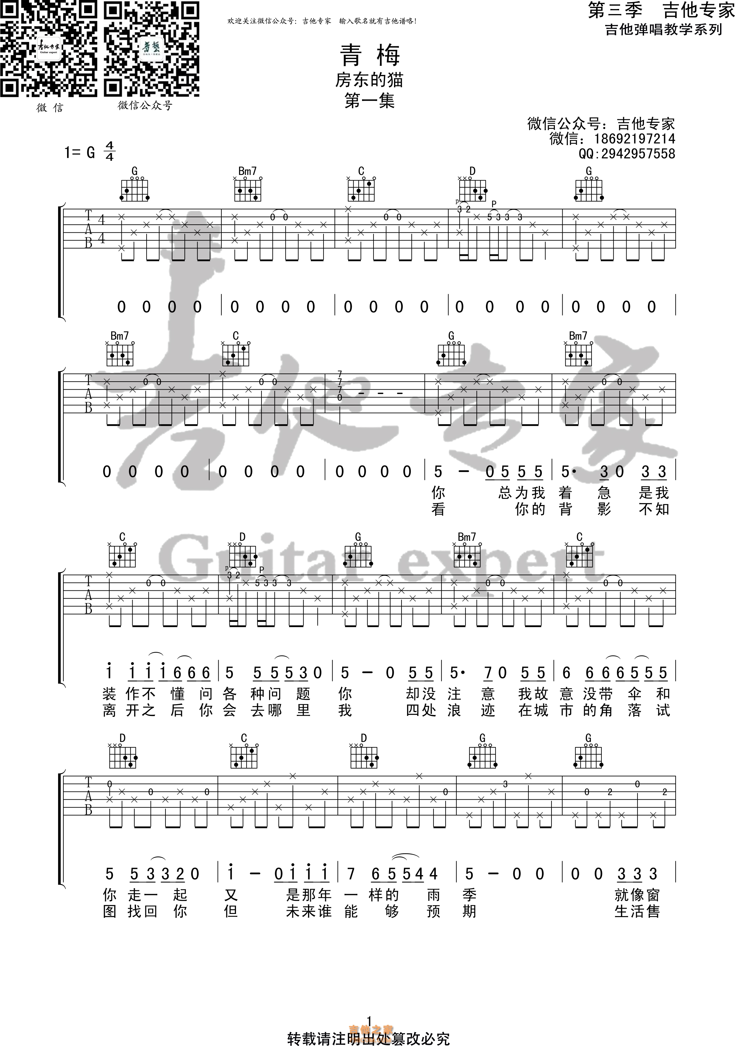青梅 房东的猫原版吉他谱 - 吉他谱