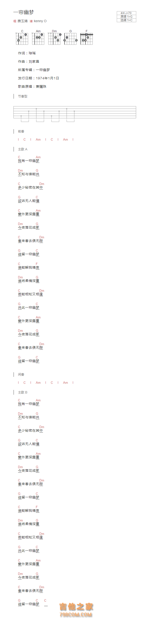 一帘幽梦吉他谱和弦版 费玉清 - 吉他谱