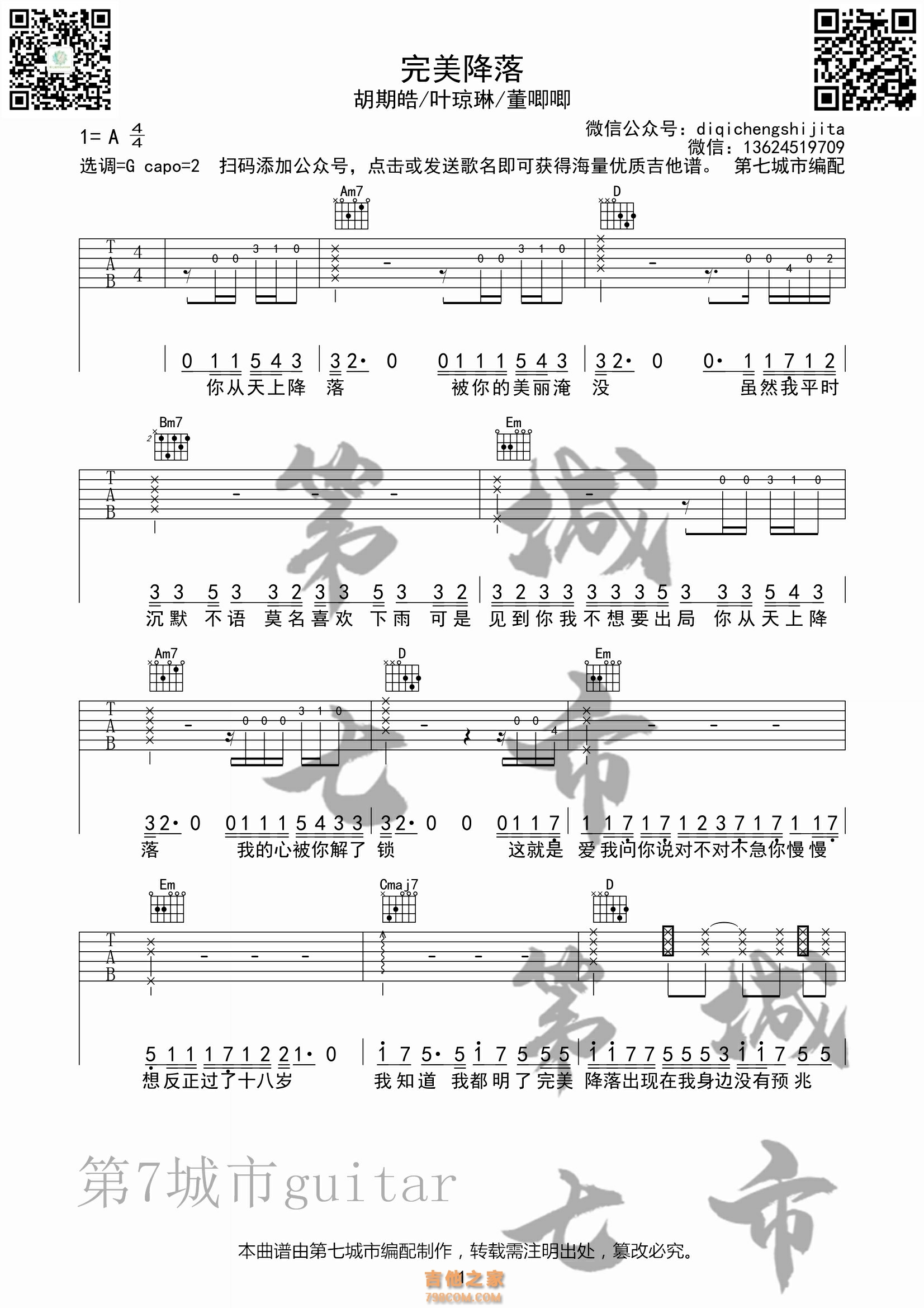 完美降落 吉他谱 第七城市编配 胡期皓、叶琼琳、董唧唧 - 吉他谱