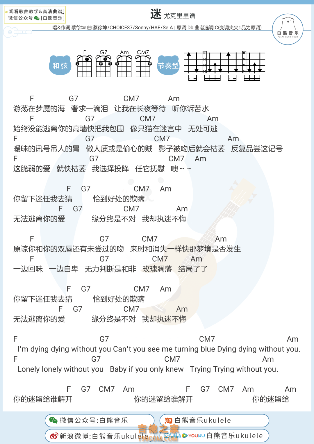 蔡徐坤《迷》尤克里里弹唱谱 白熊音乐 - 尤克里里谱