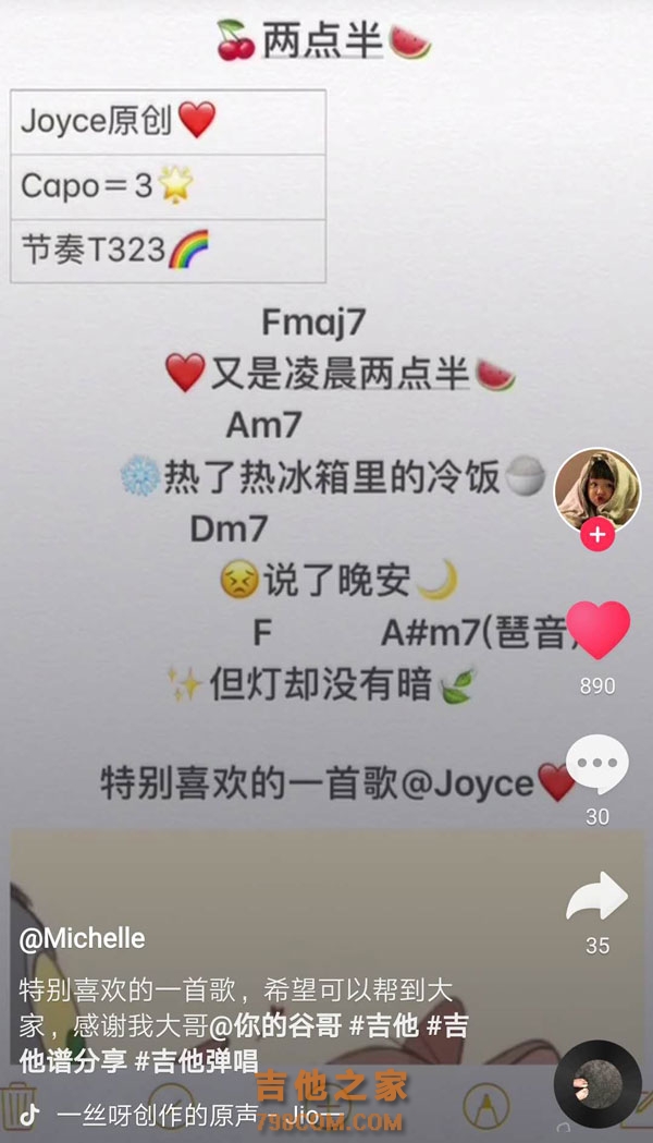 【两点半吉他谱·抖音热歌】joysaaaa《两点半》 吉他谱 - 抖音吉他谱