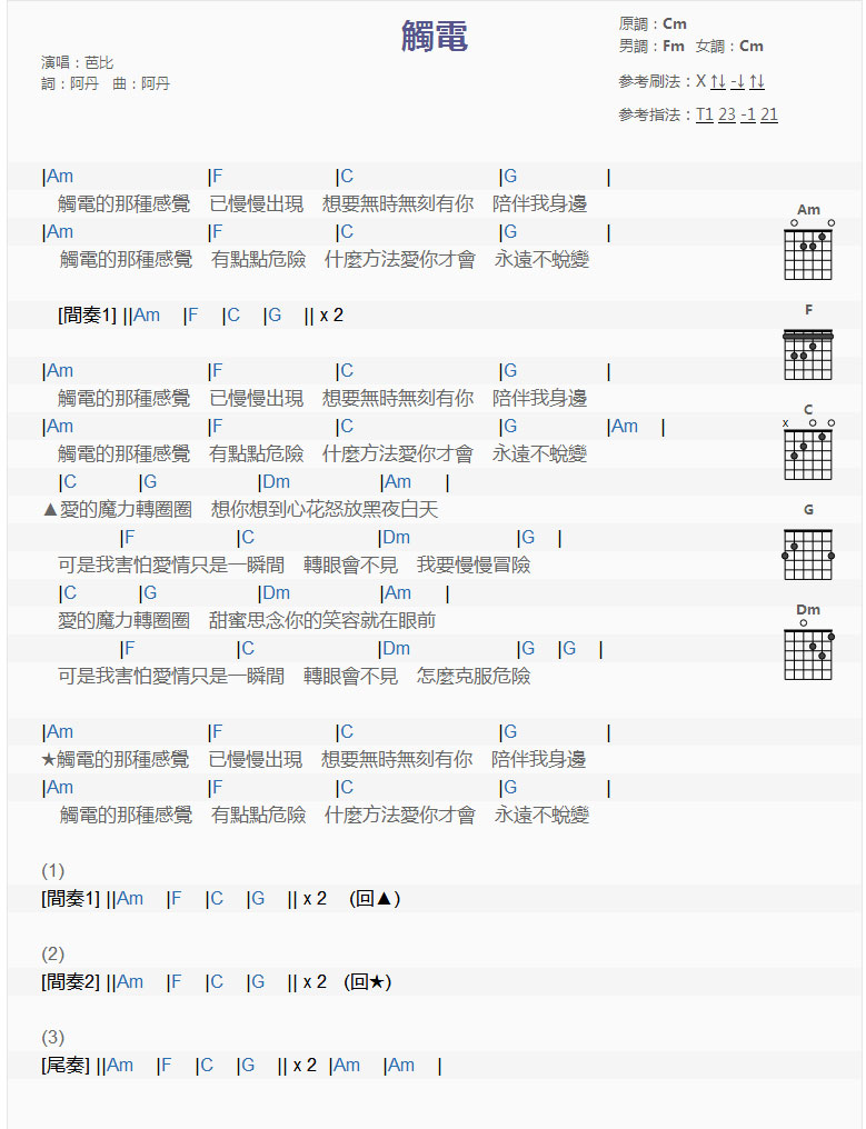 一首劲爆舞曲《芭比》触电》DJ版芭比《触电》TXT吉他谱原調:Cm男調:Fm女調:Cm演唱:芭比词:阿丹 曲:阿丹|Am |F |C |G | 触电的那种感觉 已慢慢出现 想要无时无刻有你 ...