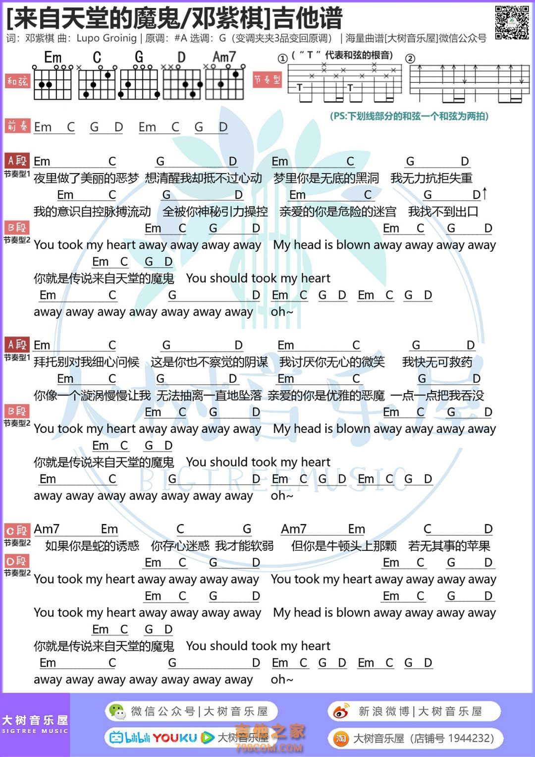 【来自天堂的魔鬼·抖音神曲】邓紫棋《来自天堂的魔鬼》吉他谱及教学视频 大树音乐屋 ... - 抖音吉他谱