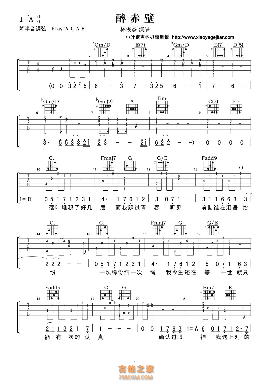 [醉赤壁抖音热曲]林俊杰《醉赤壁》吉他弹唱谱《醉赤壁》是由方文山作词,林俊杰作曲。也是网络游戏《赤壁online game》的主题曲。这首林俊杰《醉赤壁》吉他弹唱谱是由小叶吉他编配,谱子是图片吉他谱,原调为 G 调,吉他谱调为 A 调指法,节拍为 4/4 拍。