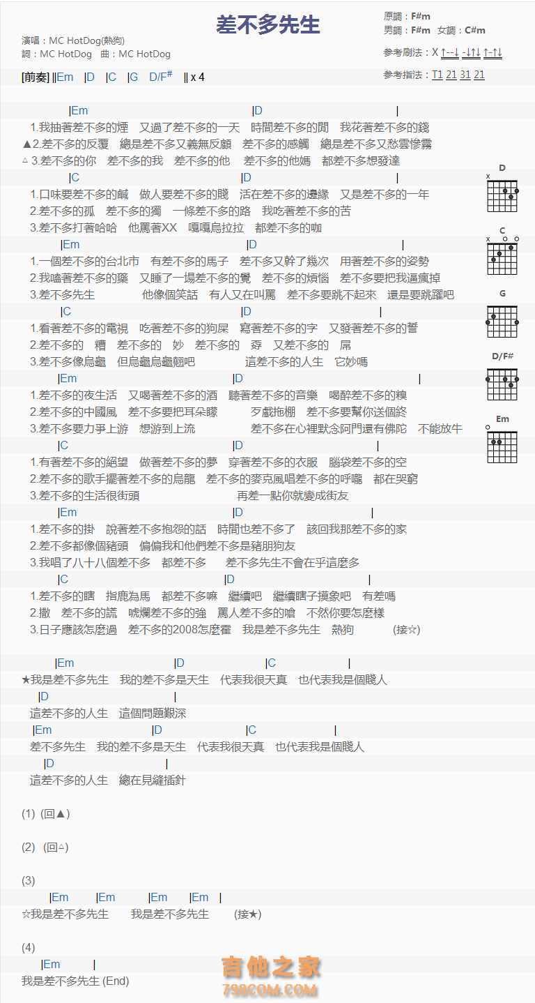 《差不多先生》吉他和弦谱原调F#m,变调夹2品MC Hotdog (热狗;Mc Hot Dog;姚中仁)原 名:姚中仁性 别: 男性星 座: 牡羊座血 型: A婚 姻: 未婚(未正式迎娶,不過跟女友已生一位小孩)身 高: 180 公分(cm)体 重: 6 ...