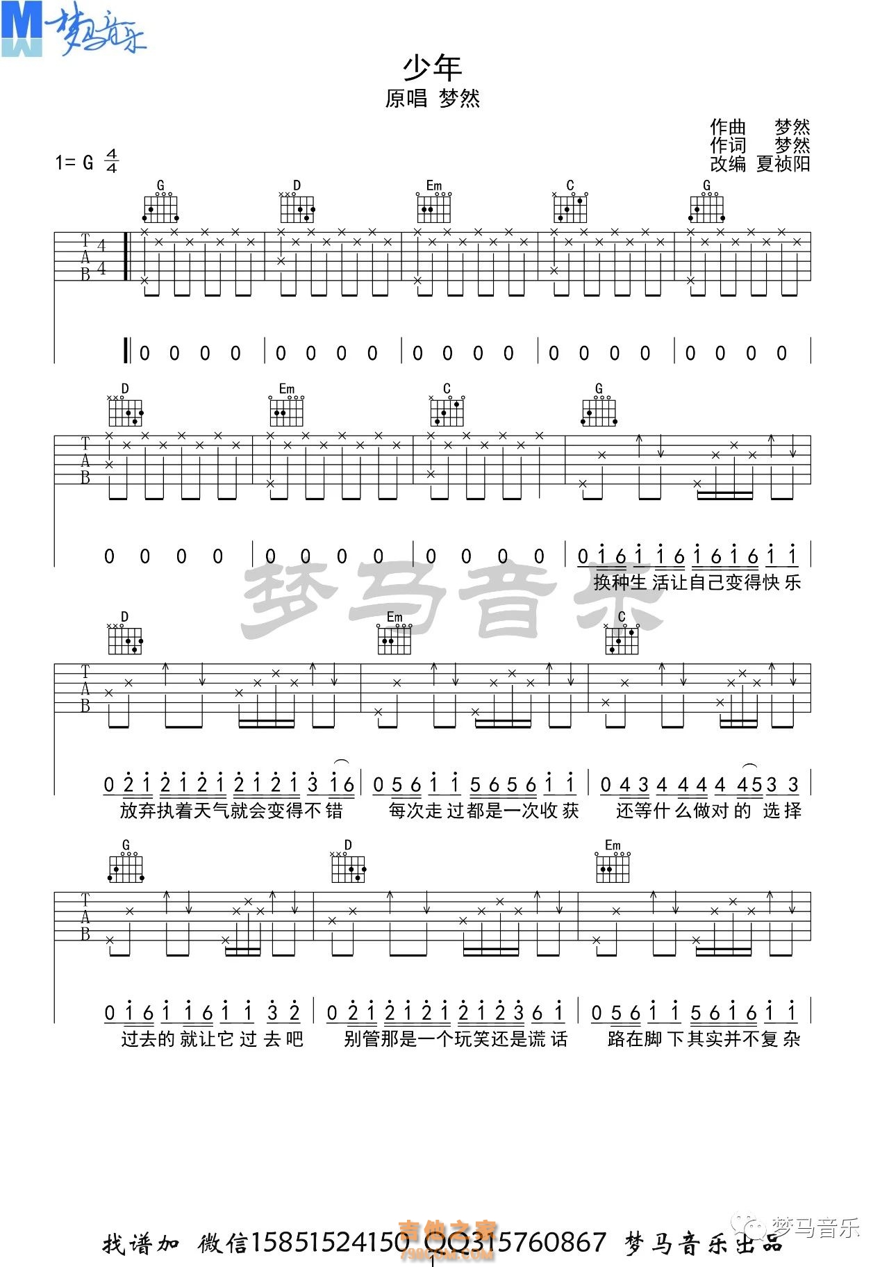 [抖音热歌]少年吉他谱G调 梦然 梦马音乐 - 抖音吉他谱