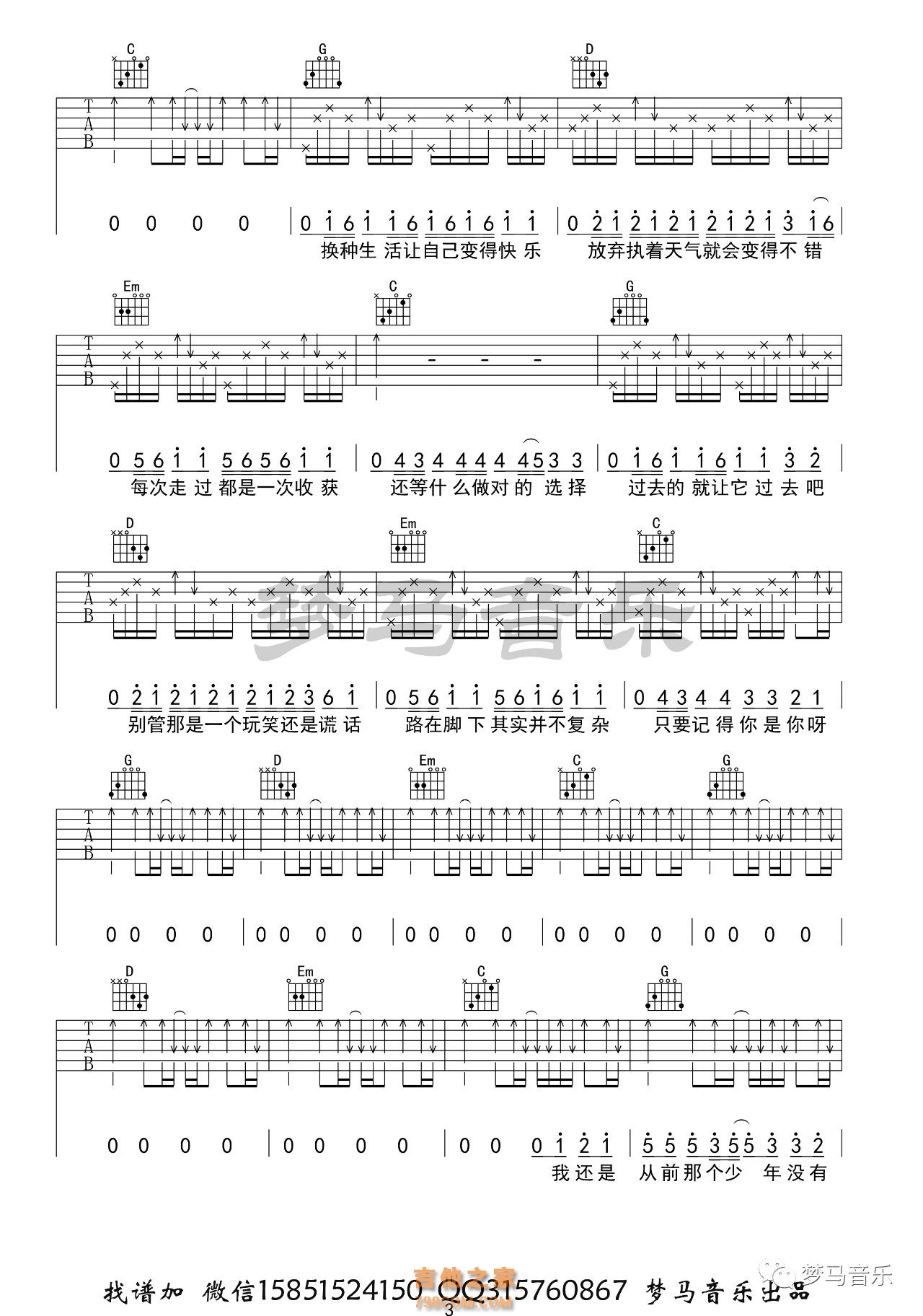 本期发布的谱子是梦然《少年》。这首歌最近在抖音上火到不行,随便刷几个视频都是这首歌。自然在公众号后台也有不少粉丝想要这首歌曲的谱子。既然这样我就编个版本给大家吧。我改编了一个适合吉他弹唱的版本,把原曲当中不适合吉他弹唱的部分给去掉的。希望大家喜欢!话说这首歌的作者居然是唱以前挺火的一首歌《没有你陪伴我真的好孤单》的歌手。我一开始以为是个新人呢。两首歌曲的曲风,编曲区别都很大。果然不断进步才能取得成功!梦然《少年》G调吉他谱