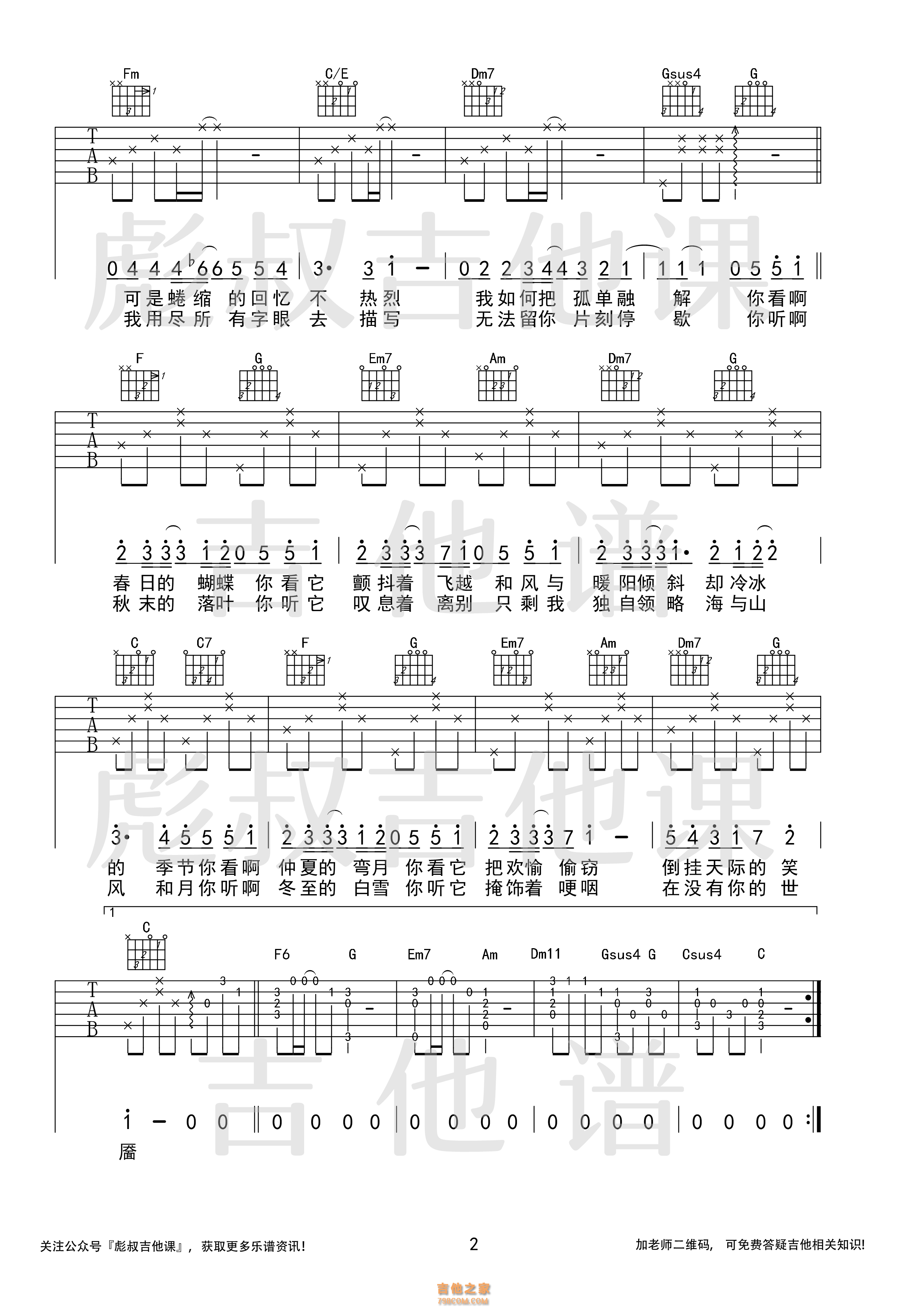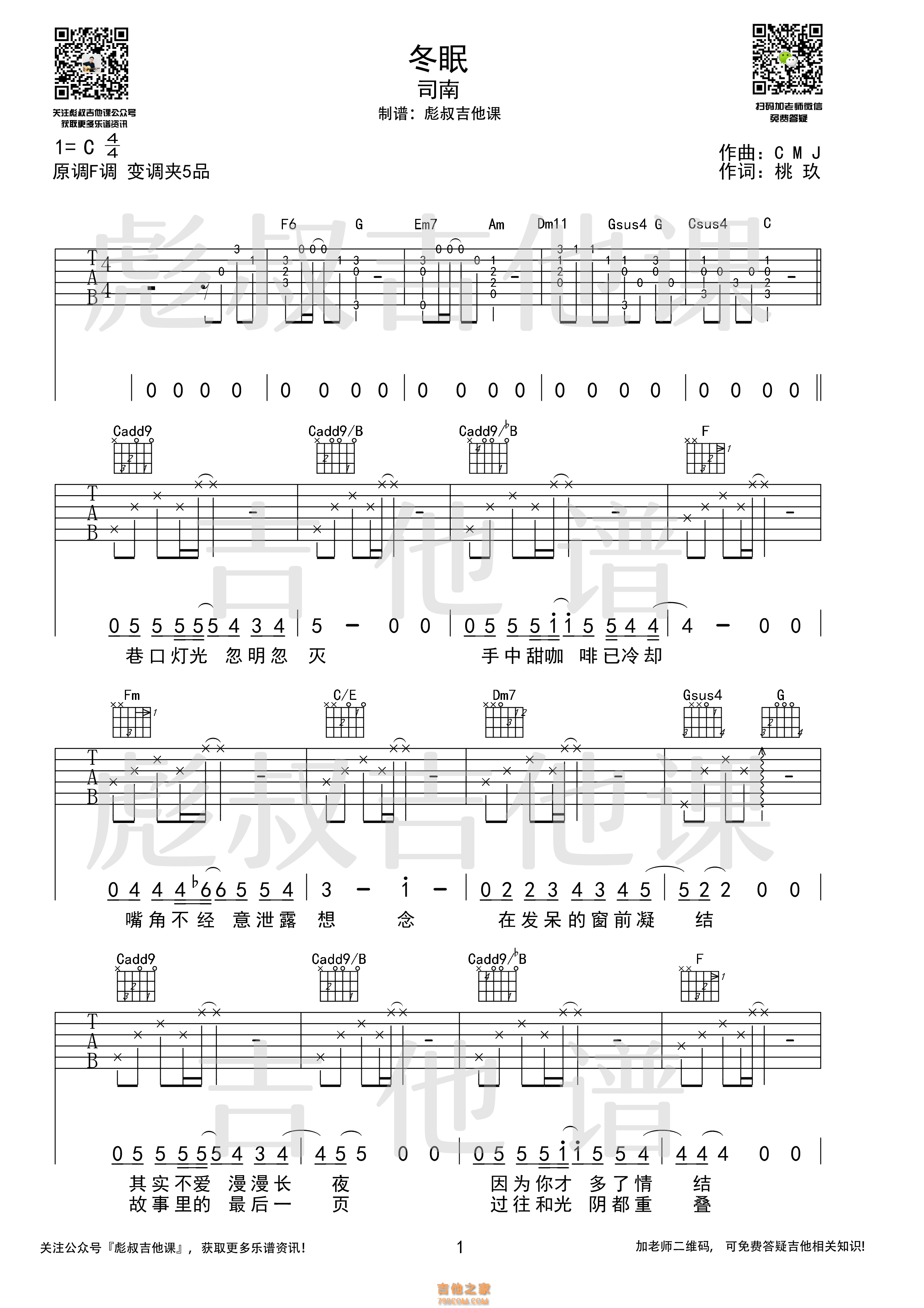 [抖音热歌]司南《冬眠》 C调弹唱六线谱 彪叔吉他课制谱 - 抖音吉他谱