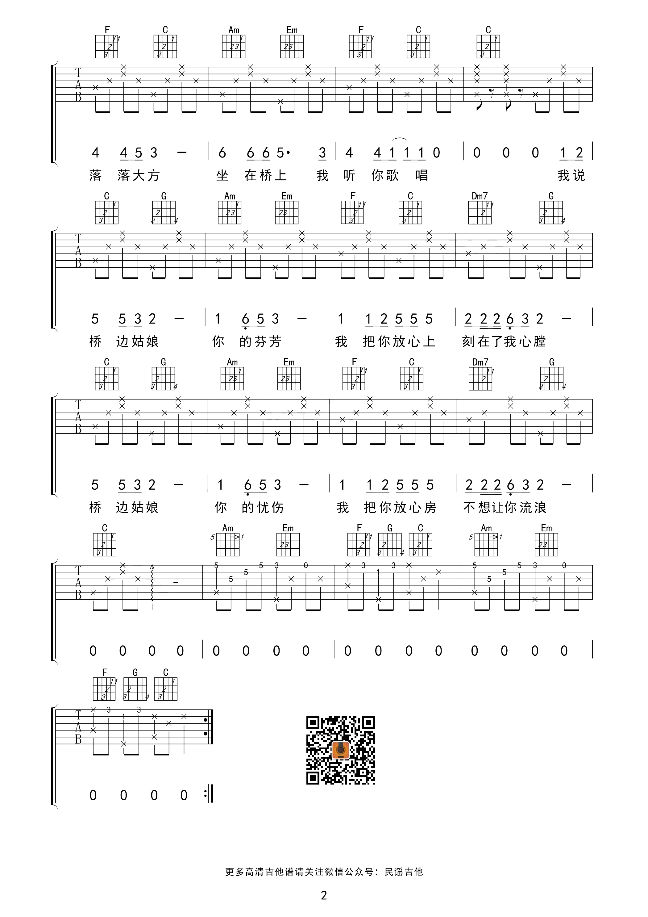 MC海伦《桥边姑娘》吉他谱_C调简单版_弹唱_木凡吉他_六线谱