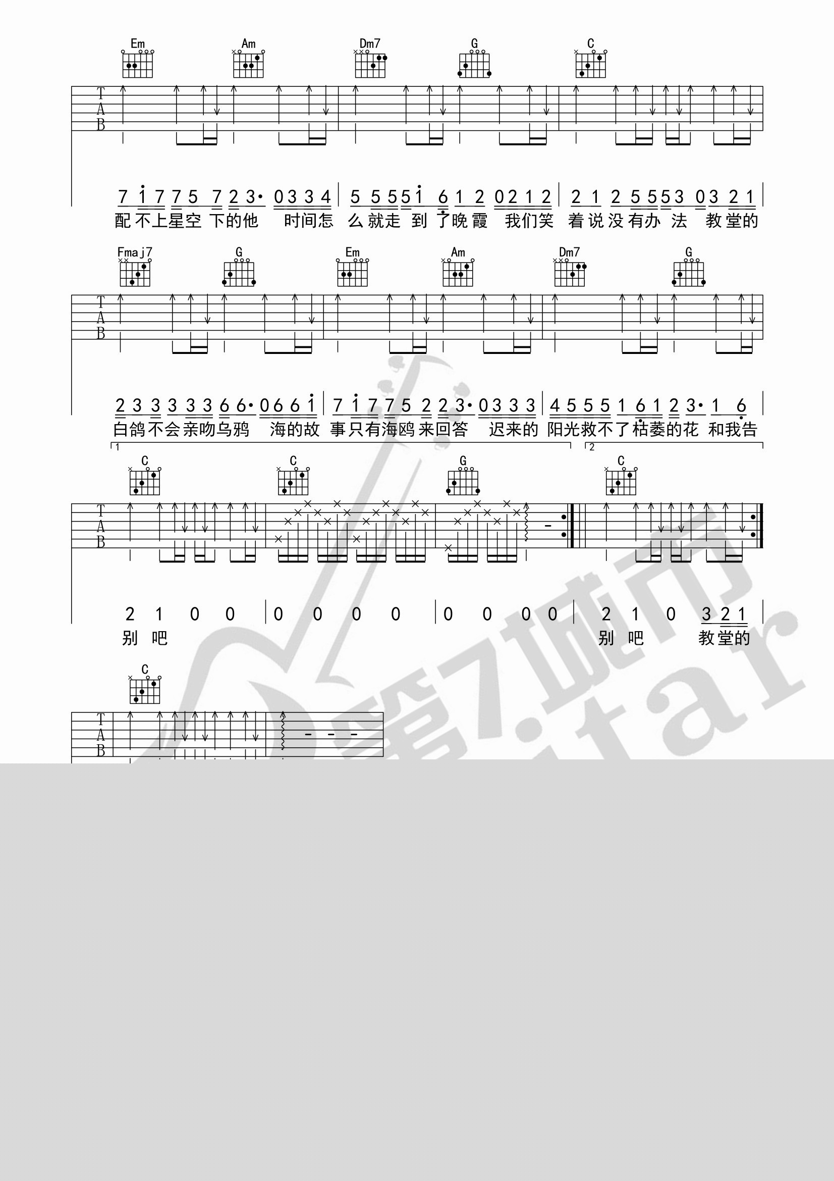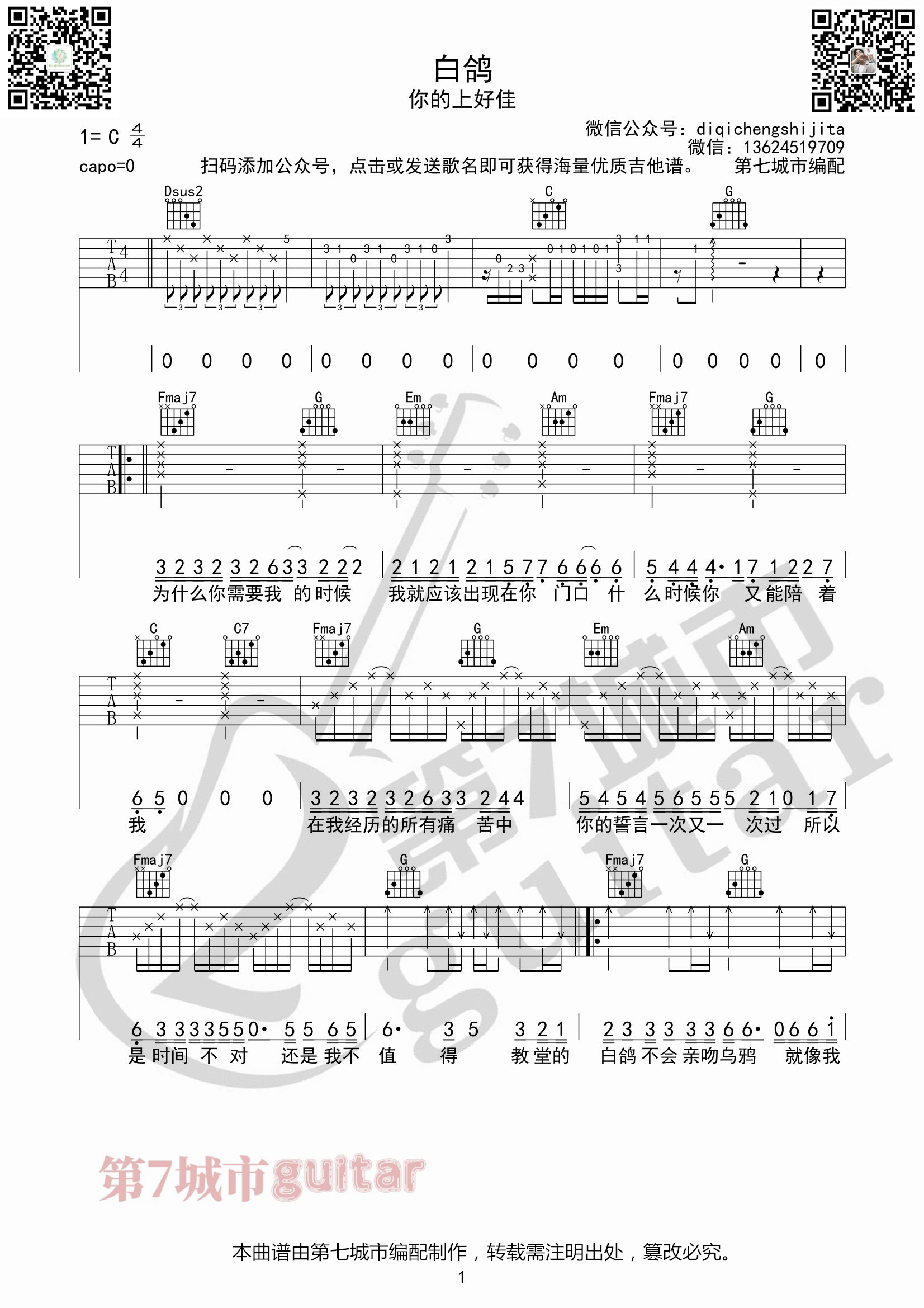 你的上好佳《白鸽》吉他谱_C调简单版_弹唱_第七城市_六线谱