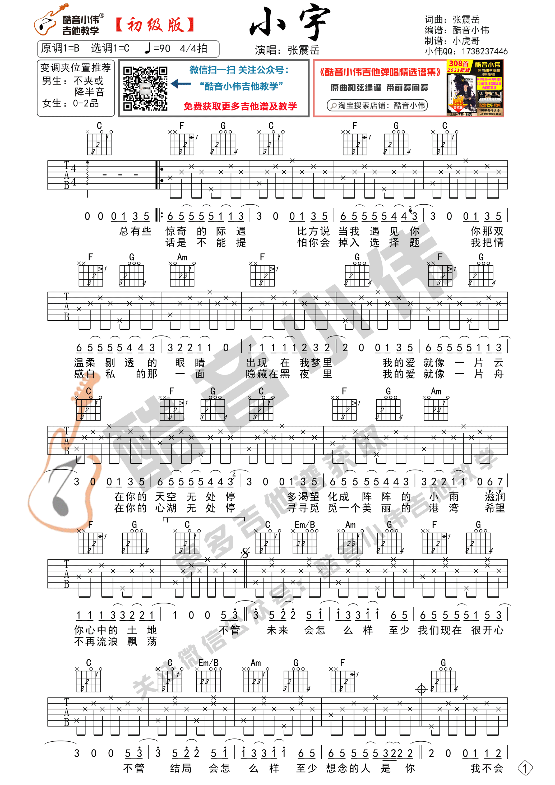 张震岳《小宇》(降半音调弦)吉他谱_C调入门版_弹唱_酷音小伟_六线谱