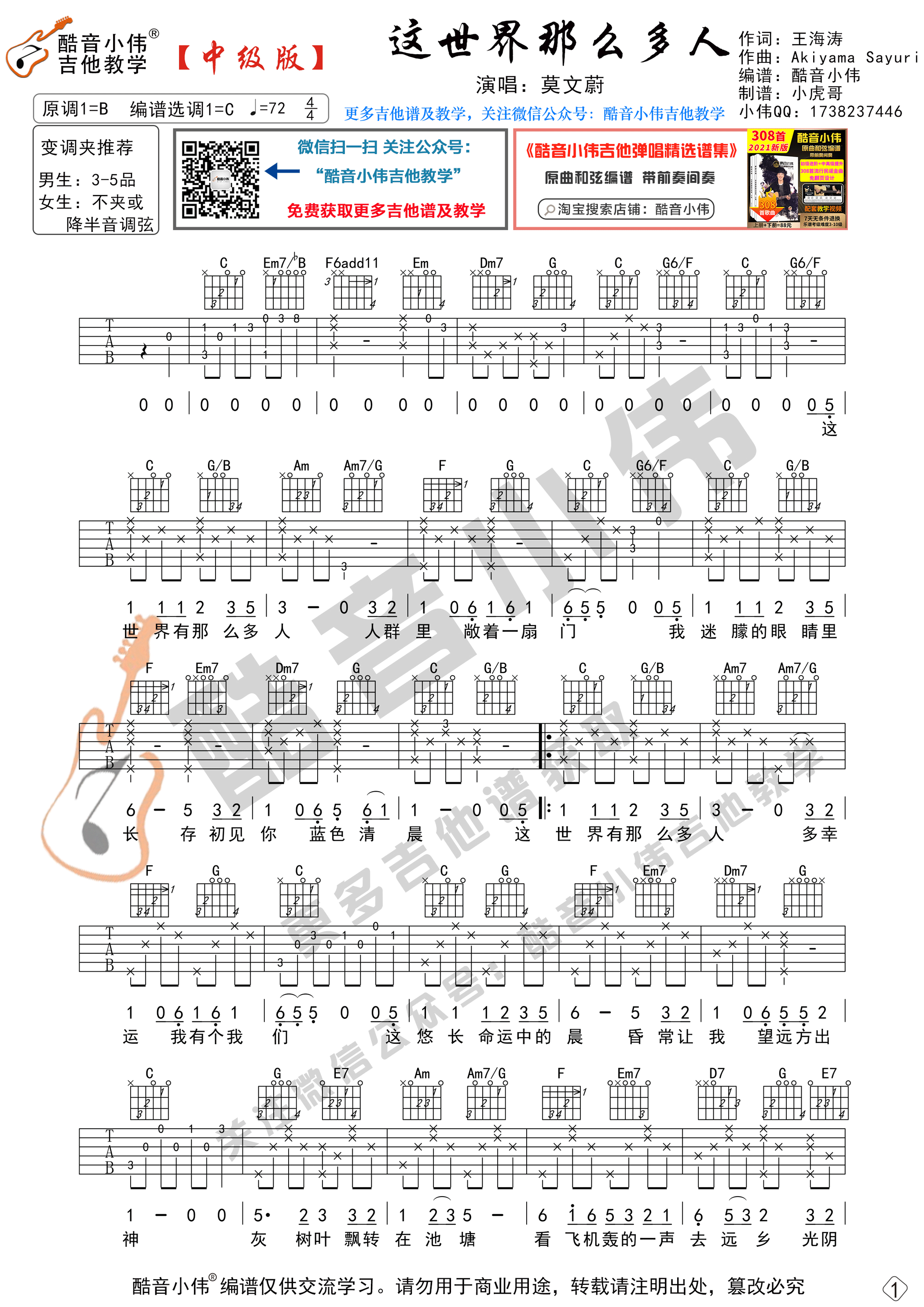 莫文蔚《这世界那么多人》(降半音调弦)吉他谱(演示&教学)_C调中级版_弹唱_酷音小伟_六线谱