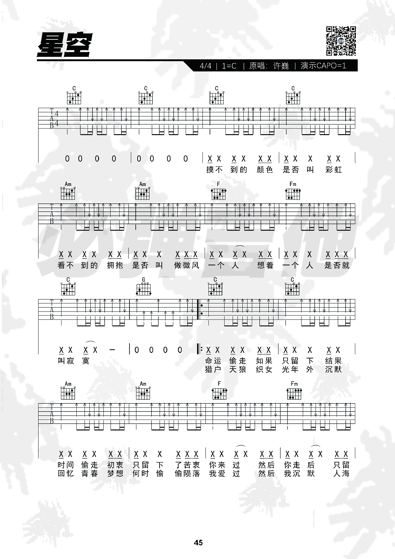 街角的晚风吉他谱,歌曲原调为降B调,此版本的曲谱来源于@网络转载,为4/4拍的节奏,按G调指法编配,共2张高清吉他谱,变调夹3品为原歌曲的调式,演唱时可按个人音域选择合适的变调夹位置。 歌曲表达了对逝去爱情的不舍与矛盾,想靠近回忆又怕受伤,藏着爱而不得的… -