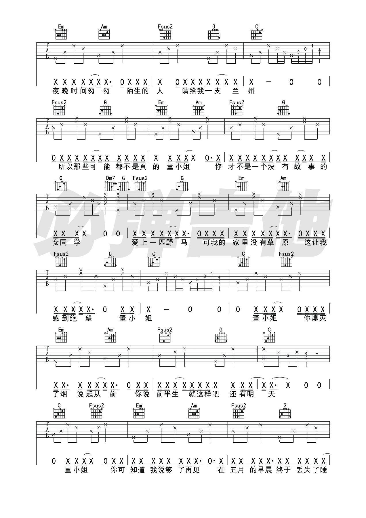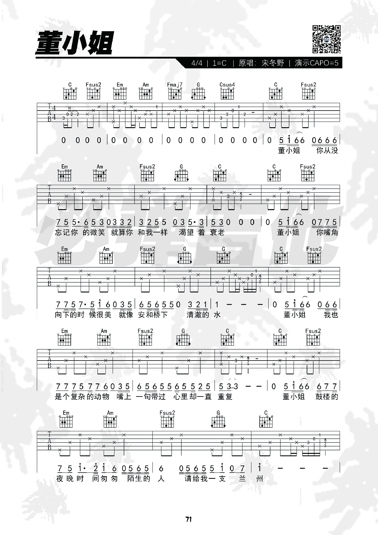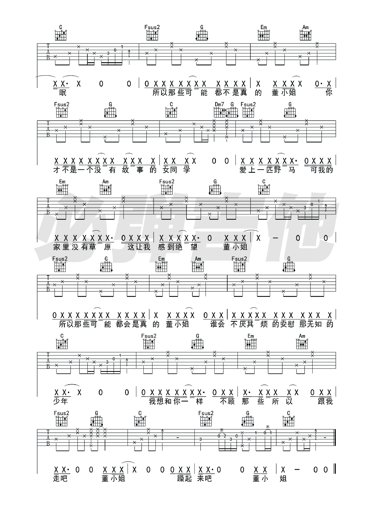 宋冬野《董小姐》吉他谱_C调简单版_弹唱_必弹吉他_六线谱