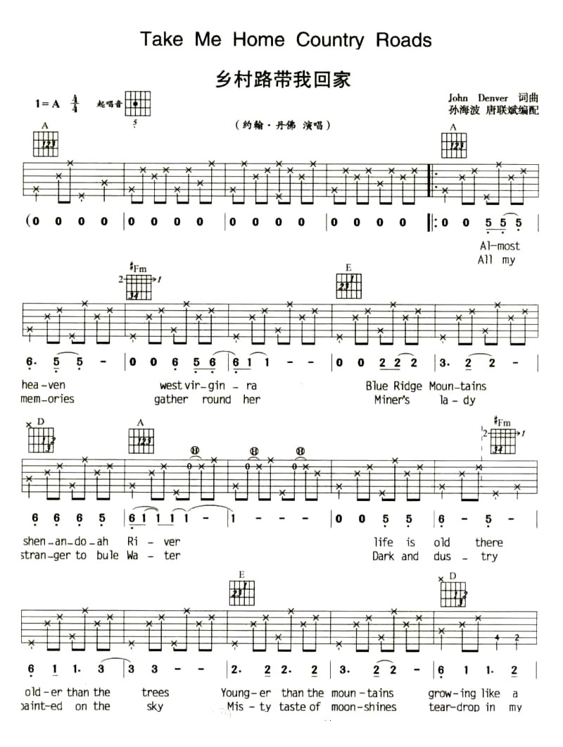 Take Me Home Country Road吉他谱,约翰·丹佛演唱,乡村路带我回家吉他弹唱谱,由孙海波唐联斌六线谱编配,一首中国人最熟悉的美国乡村歌曲,轻快的节奏中却透出一丝淡淡的忧伤,满载往昔的回忆,一同怀念带我回家的乡村小路。Take Me Home Country Road(吉他谱),唱出了每个人心底的那条“回家的路”和那座“母亲山”,不知让多少人为之潸然泪下。