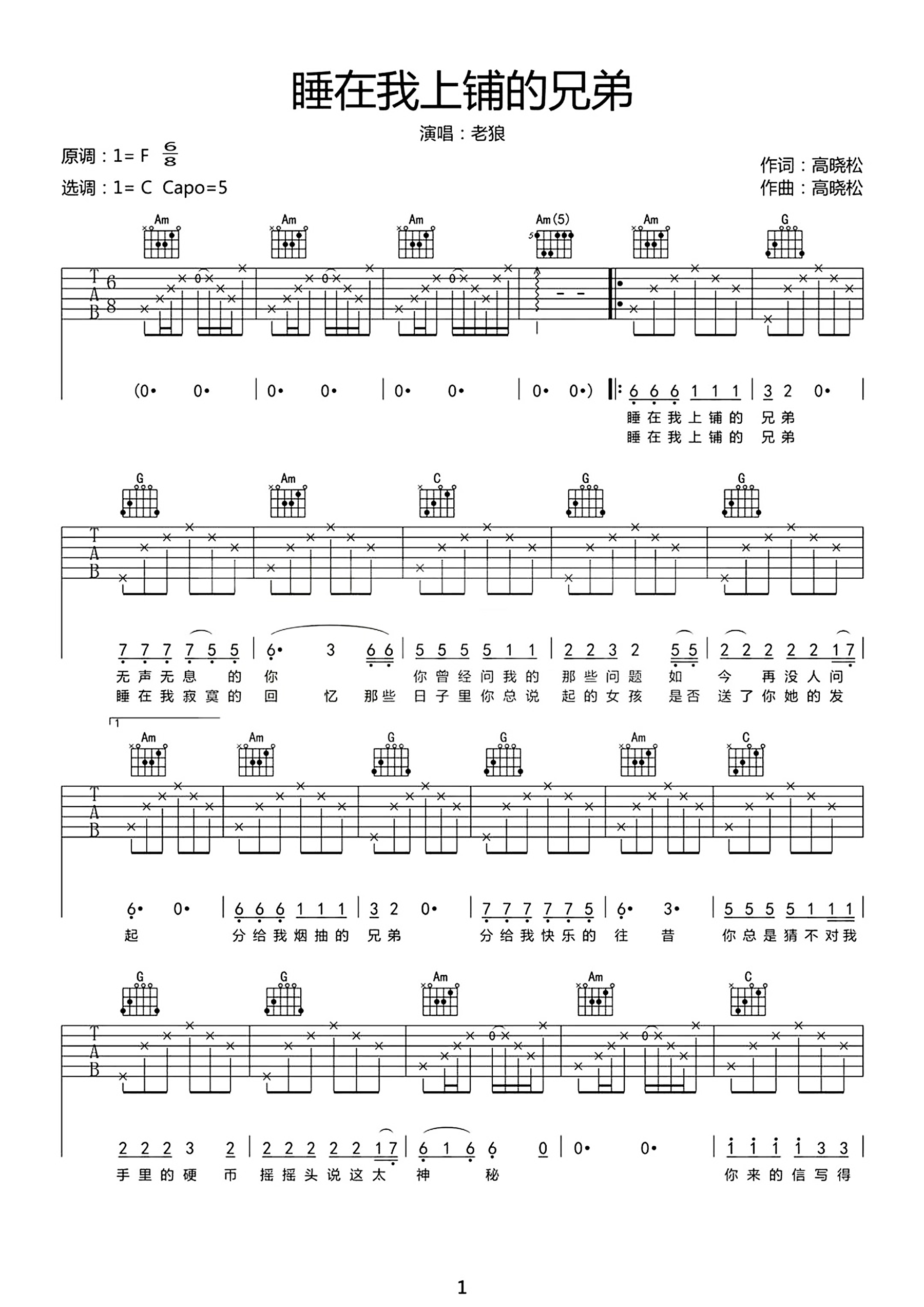 睡在我上铺的兄弟吉他谱_老狼_睡在我上铺的兄弟__睡在我寂寞的回忆_吉他谱_钢琴谱_简谱