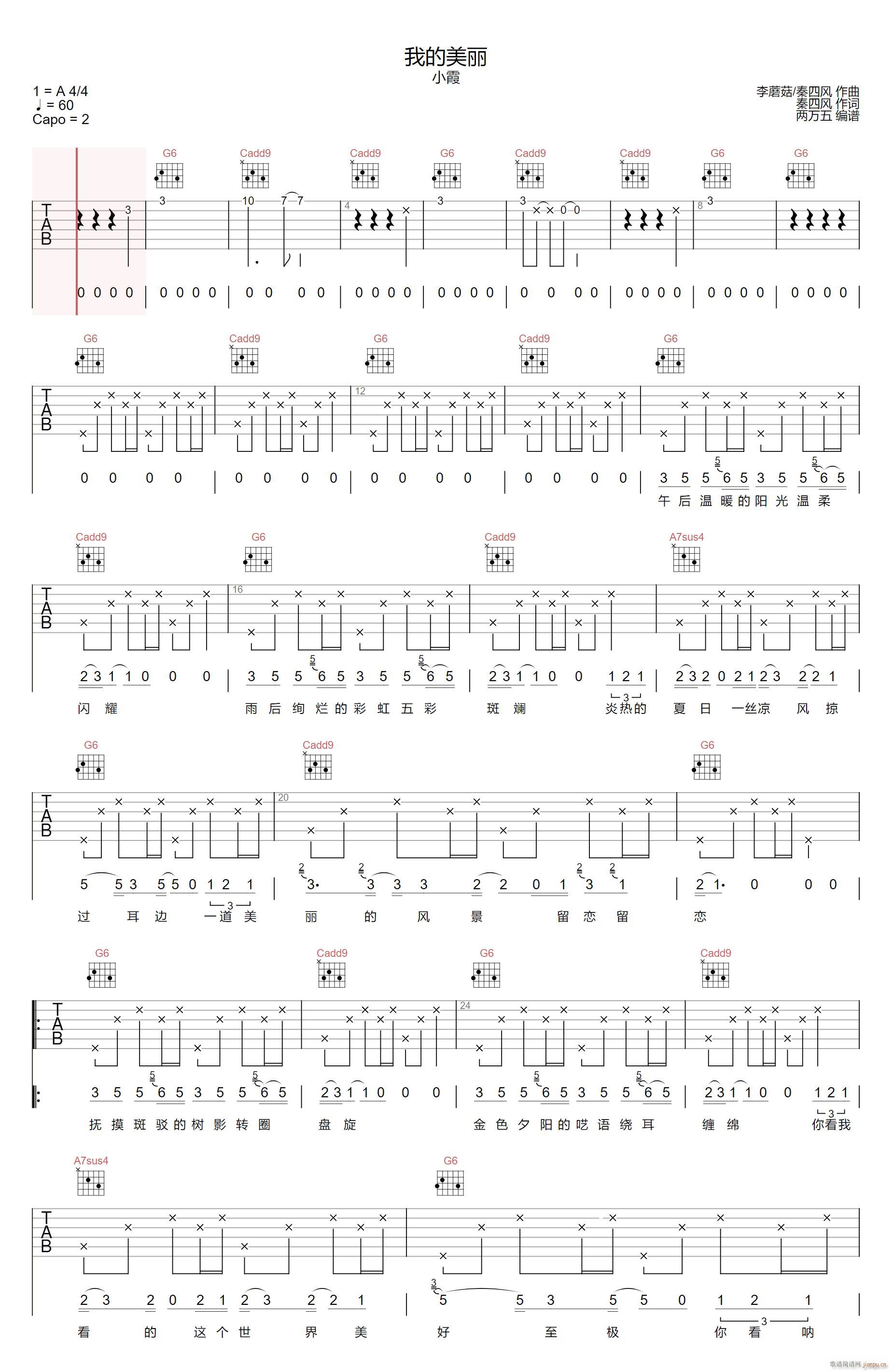 《我的美丽》吉他谱,黄绮珊演唱,《我的美丽》吉他弹唱谱,来自@亦生编配扒谱制作,本吉他谱采用A调和弦指法编配,可不用变调夹,演奏难度简单,共有3张高清六线谱图例。